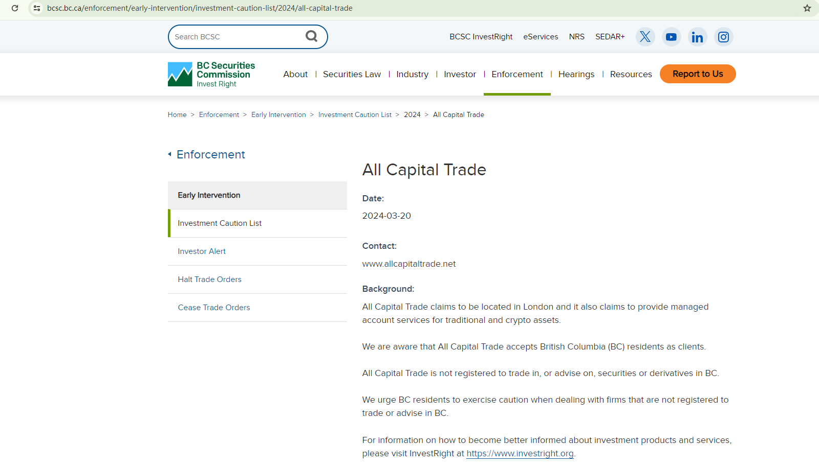 2024年3月20日,不列颠哥伦比亚省证券委员会(BCSC)对All Capital Trade发出警告,称该经纪商未在不列颠哥伦比亚省注册进行证券或衍生品交易或提供建议。https://www.bcsc.bc.ca/enforcement/early-intervention/investment-caution-list/2024/all-capital-trade
