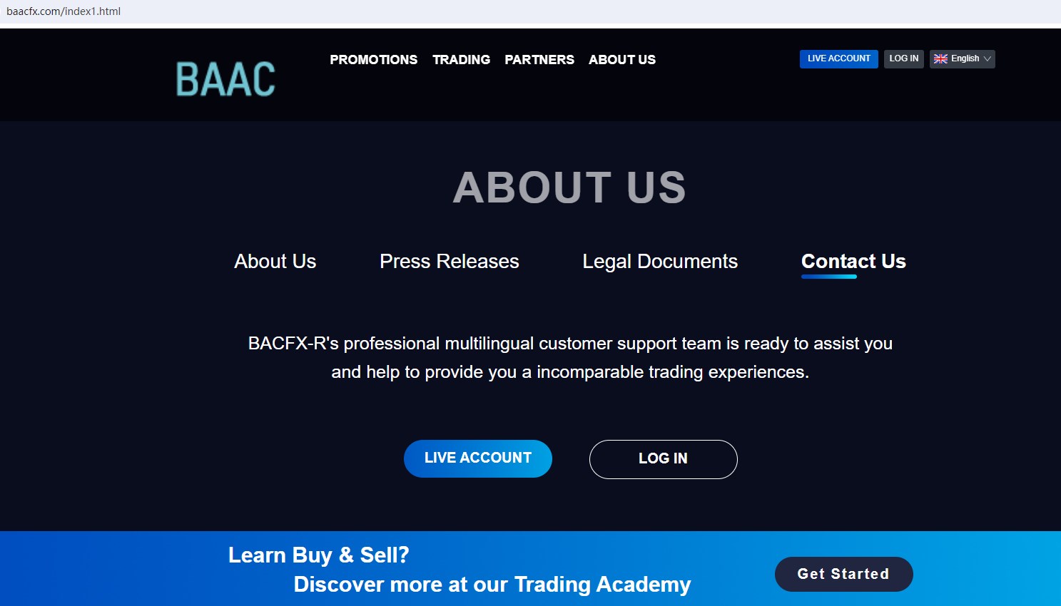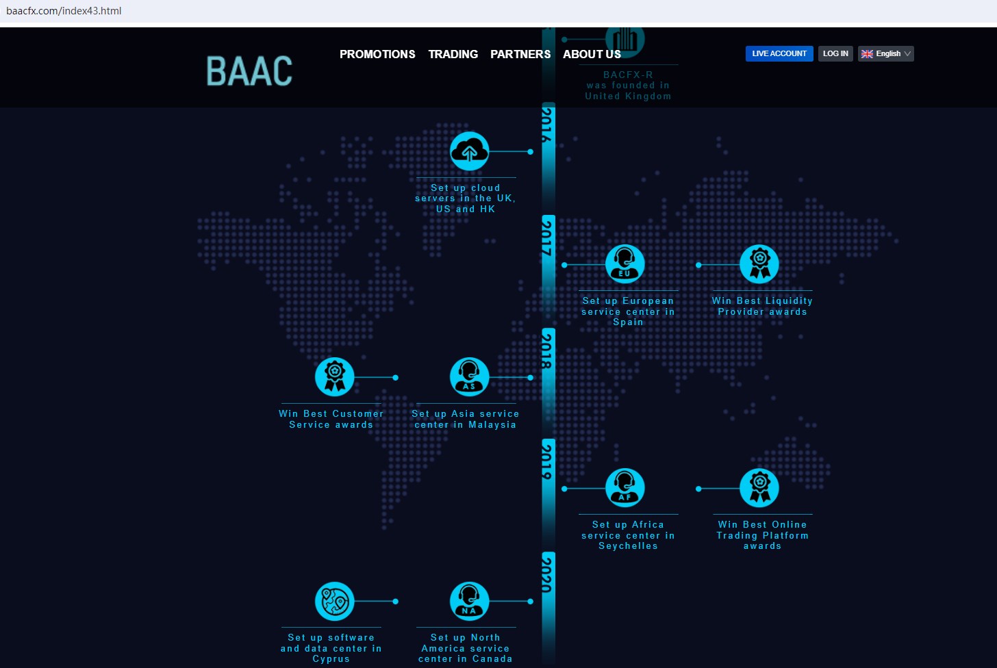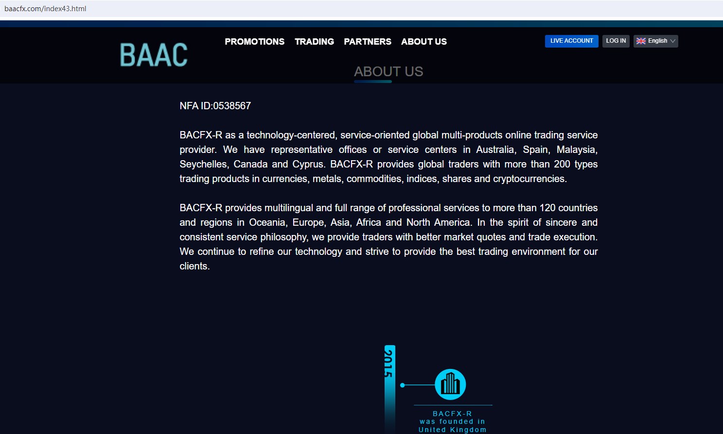 BACFX-R 自称是一家在英国成立的在线交易服务提供商,在多个国家设有办事处或服务中心,并受美国国家期货协会 (NFA) 监管,ID 为 0538567 和 ID 0539541,提供广泛的金融服务,包括货币、金属、商品、指数、股票和加密货币以及全球市场上的更多工具。