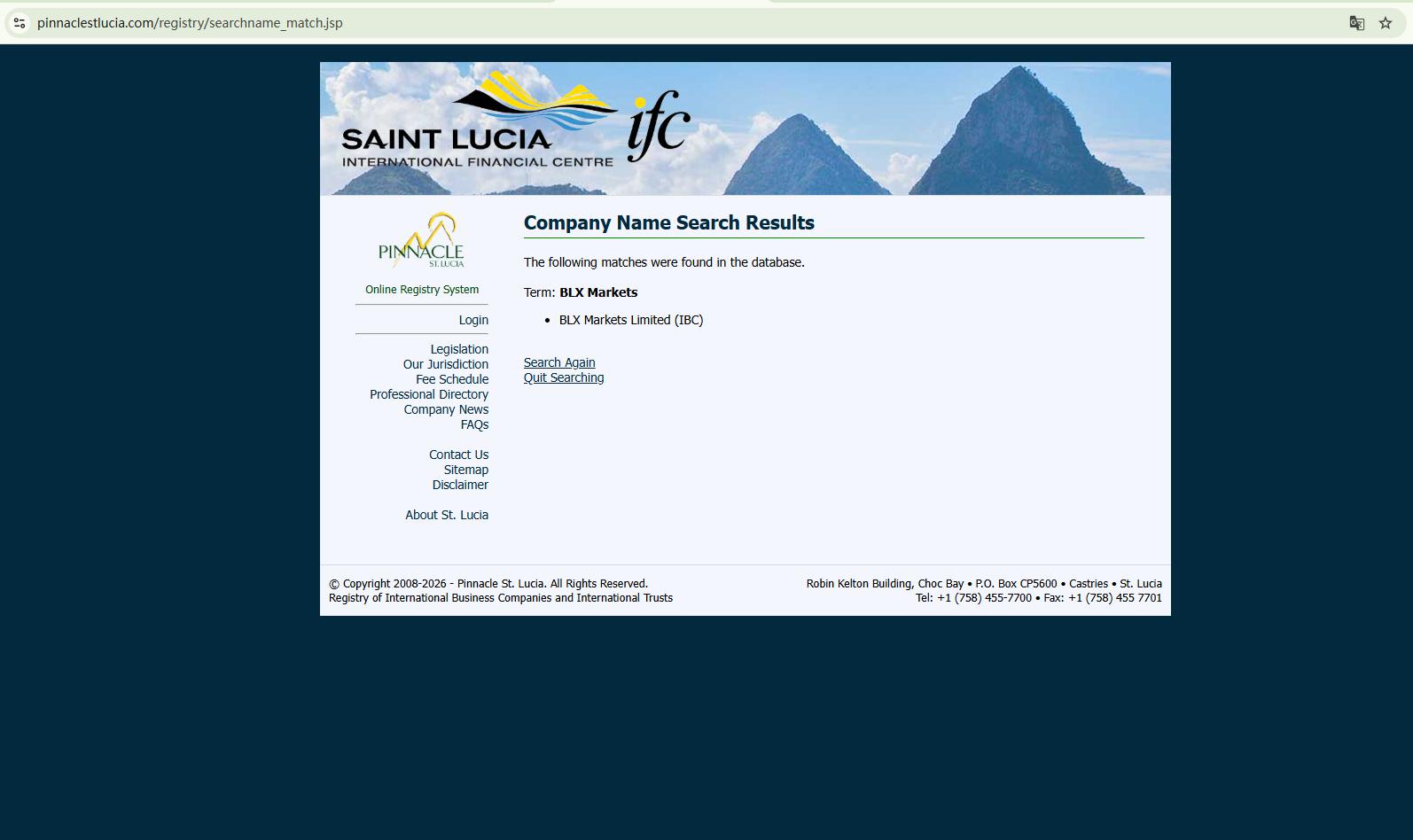 While BLX Markets Limited appears to have completed a registration with the Saint Lucia International Financial Centre (IFC), this registration only signifies the incorporation of an International Business Company (IBC). It does not constitute a valid broker's license, as the Saint Lucia IFC does not regulate foreign exchange or issue licenses to forex dealers.