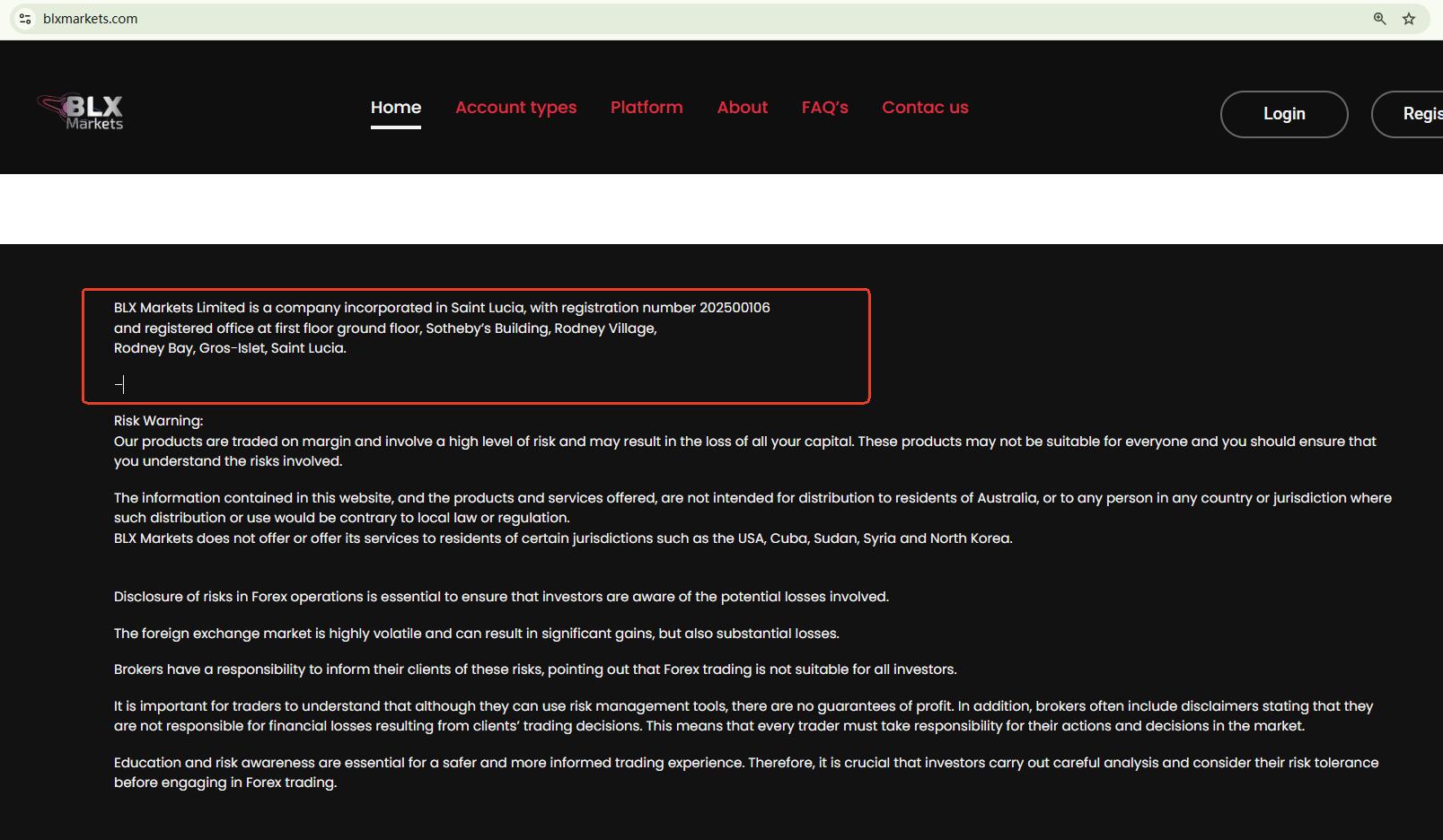 BLX Markets appears to be a platform with a high propensity for fraud due to its lack of effective regulation. It provides no information regarding regulatory oversight or licensing, merely claiming to be registered in Saint Lucia.