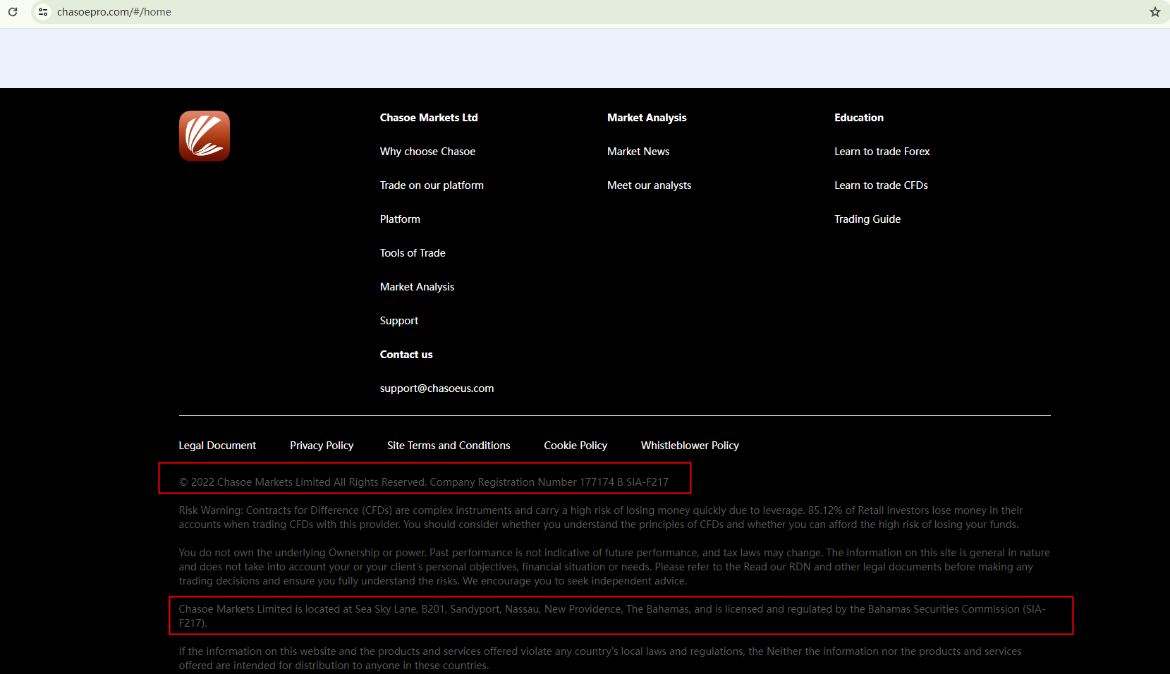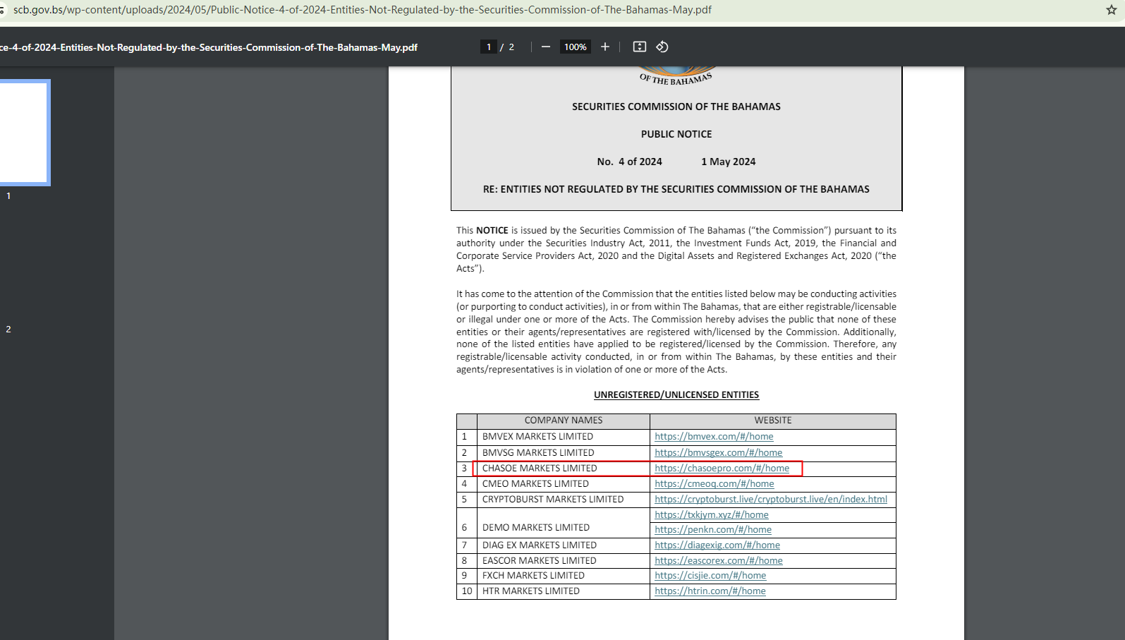 2024年5月1日,巴哈马证券委员会(SCB)将Chasoe列入警告名单,原因是其未经许可提供金融服务或产品。https ://www.scb.gov.bs/wp-content/uploads/2024/05/Public-Notice-4-of-2024-Entities-Not-Regulated-by-the-Securities-Commission-of-The-Bahamas-May.pdf