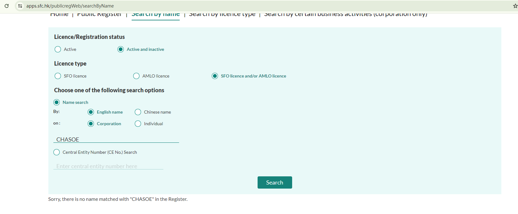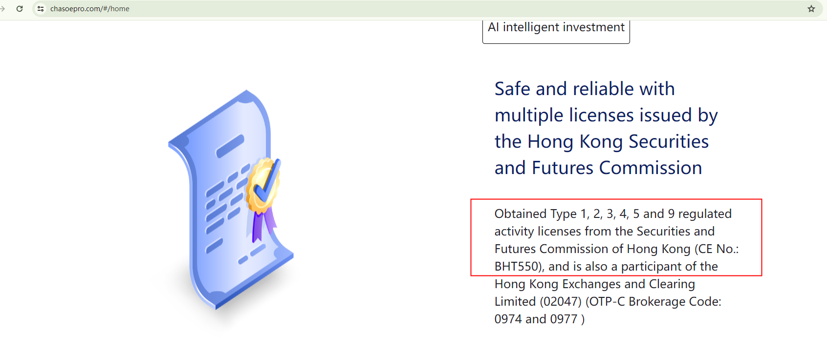 此外,我们向香港证券及期货事务监察委员会(证监会)核实后发现,Chasoe并未获得证监会的牌照。