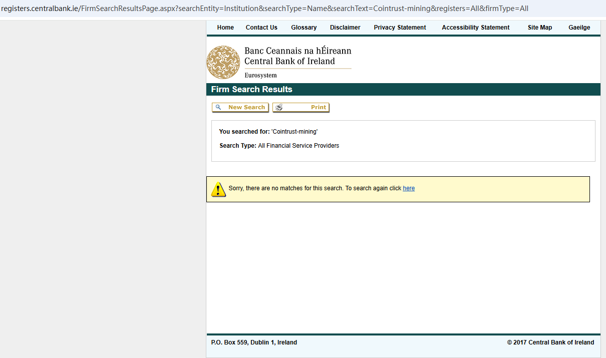 经调查,我们发现 Cointrust 挖矿并未获得爱尔兰中央银行 (CBI) 的授权和监管。