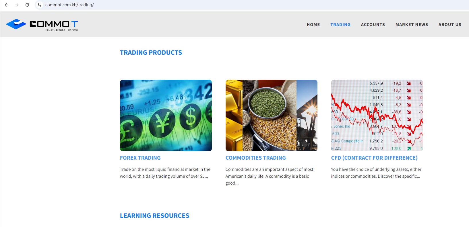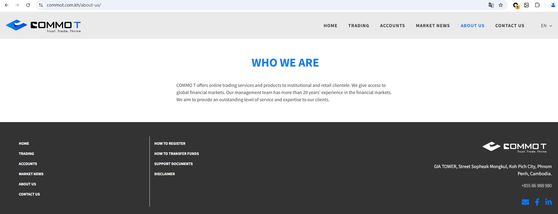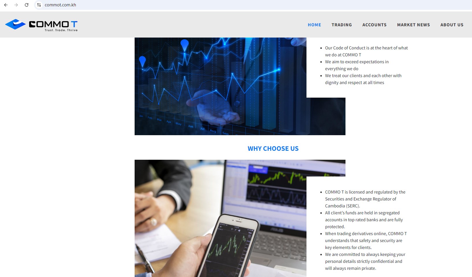 COMMO T 声称是一家获得柬埔寨证券交易监管机构 (SERC) 许可和监管的在线交易平台,为机构和零售客户提供在线交易服务和产品,包括外汇、商品、差价合约以及更多用于在全球市场交易的工具。