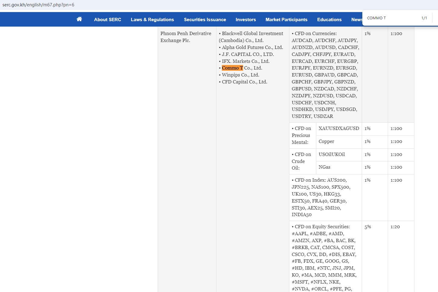 经调查,我们发现 Commo T Co., Ltd 是一家获得 SERC 批准的衍生品经纪商,但该公司在公司名单中没有运营网站,而且柬埔寨没有外汇交易经纪活动的许可证。