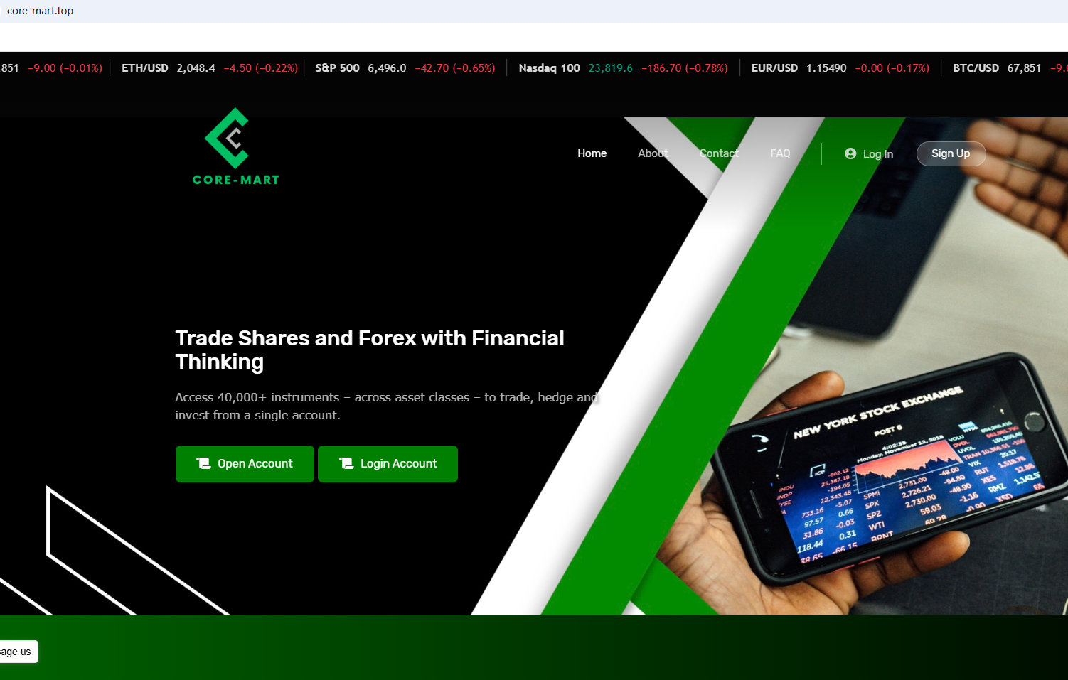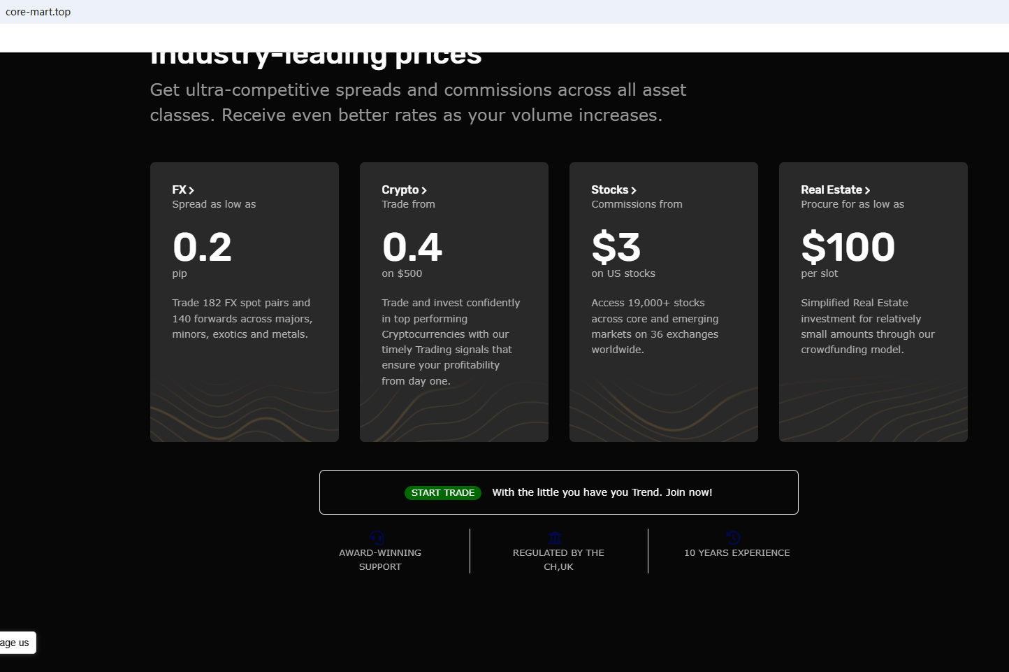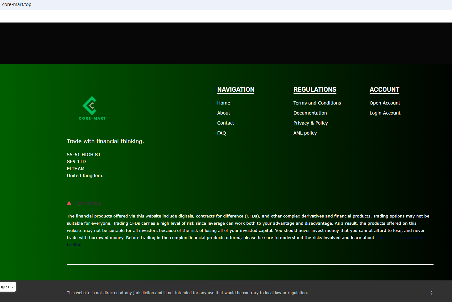 该网站使用诈骗网站常用的模板,此前已被 Brokersview 多次标记。它声称已在英国公司注册处 (CH) 注册。众所周知,CH 无权监管外汇交易。此外,英国金融行为监管局 (FCA) 也曾就 Core Mart 发出警告,怀疑该公司可能在未获得必要授权的情况下提供金融服务或产品。
