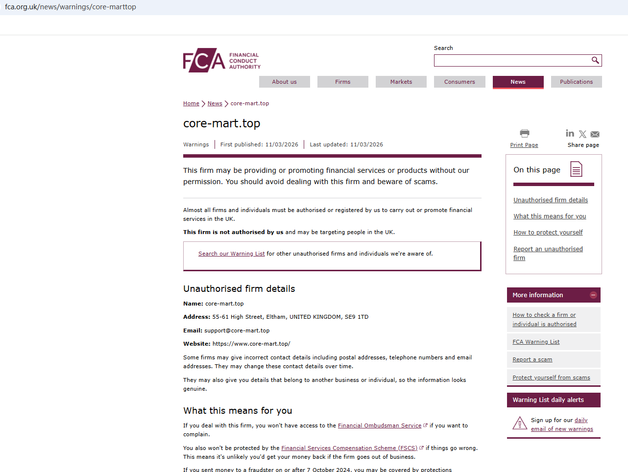 2026年3月11日,英国金融行为监管局(FCA)发布警告,怀疑Core Mart公司可能在未获得必要授权的情况下提供金融服务或产品。https ://www.fca.org.uk/news/warnings/core-marttop