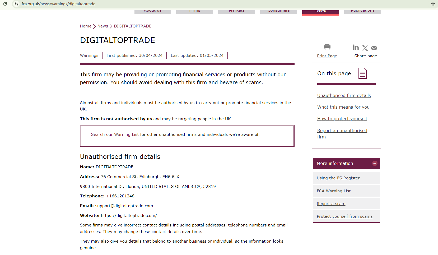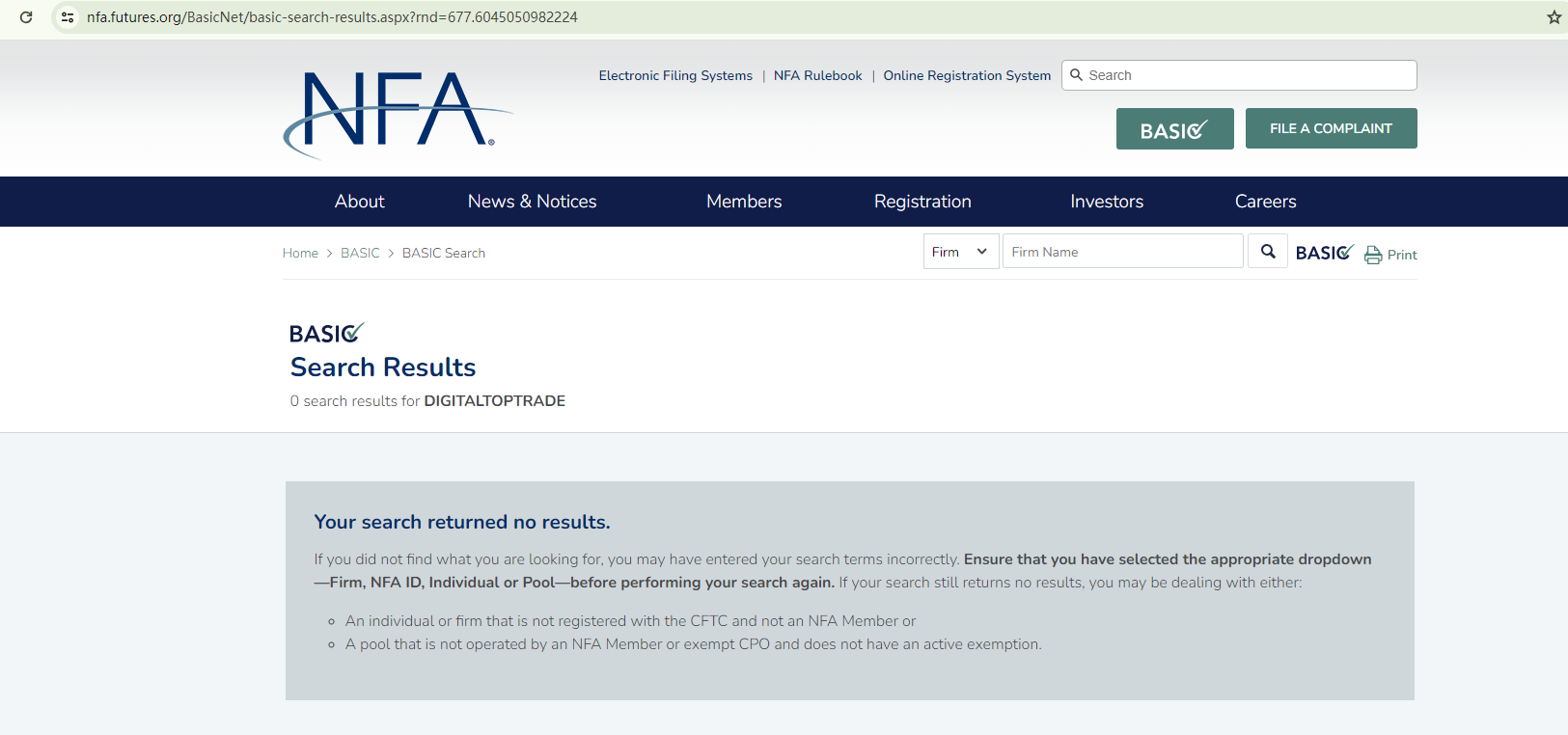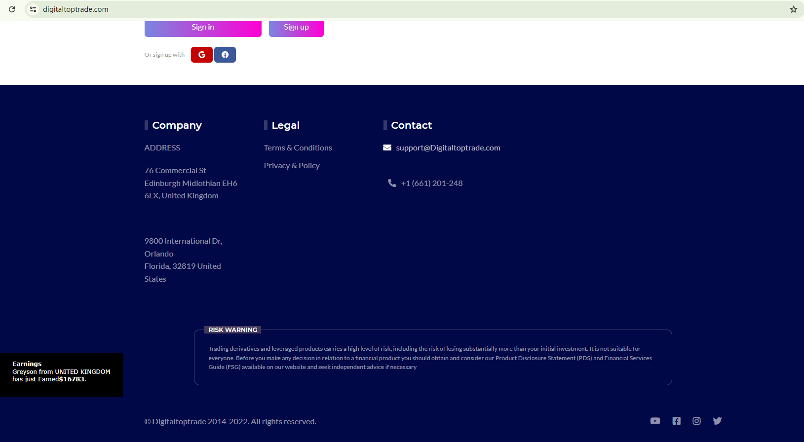 DIGITALTOPTRADE 声称在英国和美国都设有办事处。但是,没有证据表明它已在英国金融行为监管局 (FCA) 或美国国家期货协会 (NFA) 注册。值得注意的是,FCA 已针对 DIGITALTOPTRADE 发出警告,建议投资者避开这家未经授权的公司。