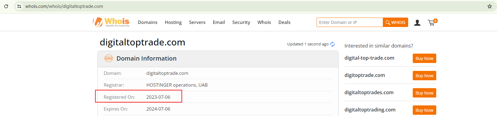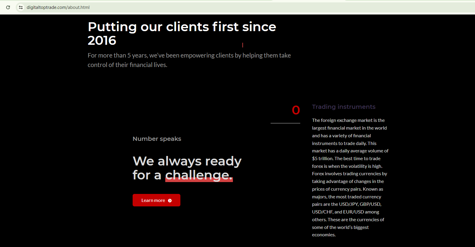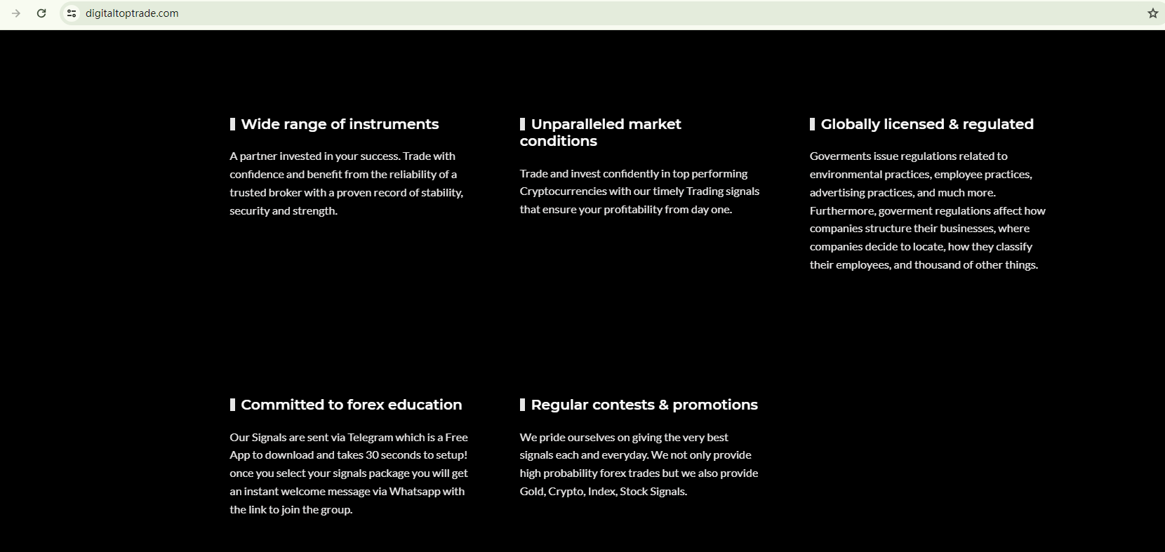 实质上,DIGITALTOPTRADE 不受任何管理机构的监管。将投资者的资金委托给它风险很大,因为没有任何法律保护措施来保障资金安全。