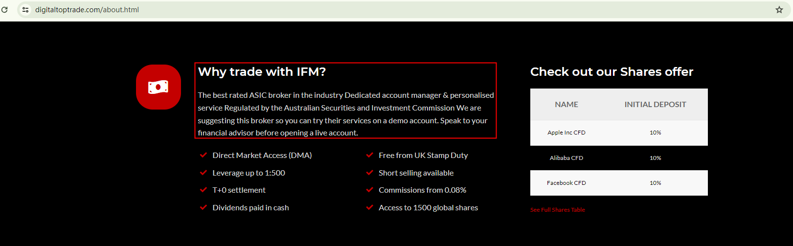 看来 DIGITALTOPTRADE 在没有仔细审查模板提供的预先编写的内容的情况下匆忙建立了这个网站。有趣的是,它称自己为 IFM,据称是受 ASIC 监管的经纪商。尽管其域名是在 2023 年底注册的,但该网站声称自 2016 年以来一直在运营。此外,网站上缺乏具体的监管信息来证实其声称是“全球监管的经纪商”。