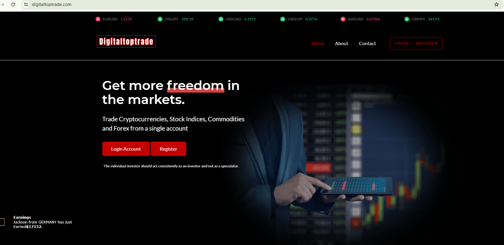 DIGITALTOPTRADE 是因使用经常与欺诈活动相关的网站模板而引起怀疑的经纪人之一。此模板提供预先编写的内容和图形设计,可以轻松快速地建立一个给人以合法经纪人印象的网站。但是,经过仔细审查,本网站并未达到预期标准。