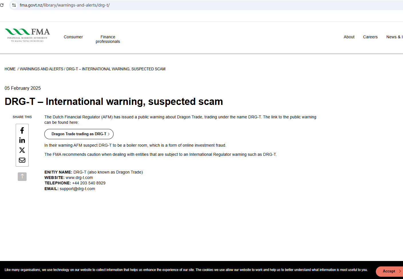 • 2025-02-04 新西兰金融市场管理局 (FMA) 针对 DRG T(又名 Dragon Trade)发出警告