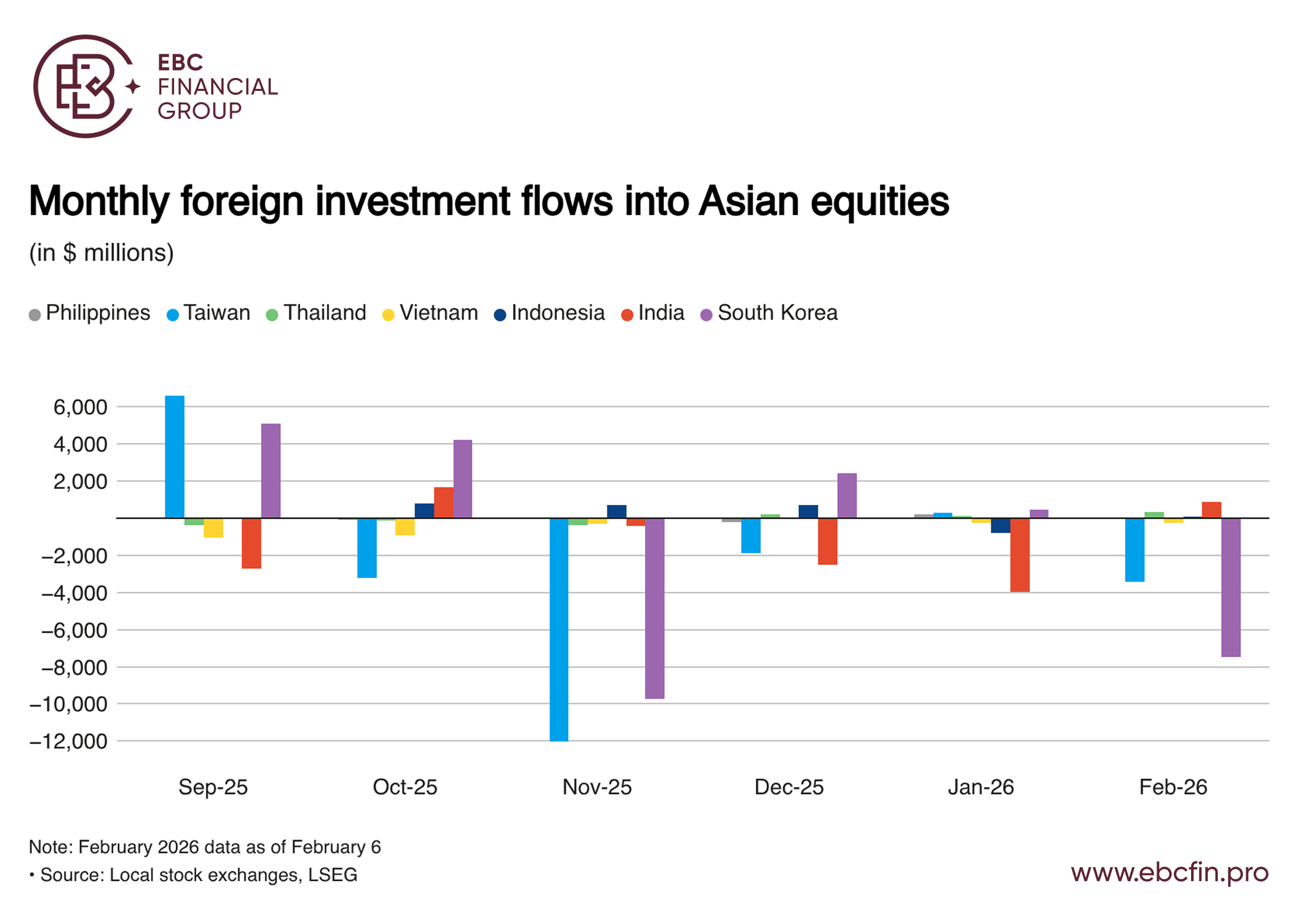 Foreign investors sold a net $9.79 billion worth of Asian stocks in the first week of February as South Korea came under the most pronounced pressure from the technology rout.