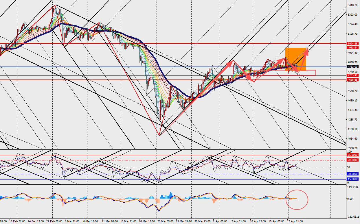 On the H4 chart, we can see gold is moving near the 48 hours moving average. In addition, the MACD double line and energy bars are converging around the zero axis. The buy limit could be placed, stop loss is mandatory.