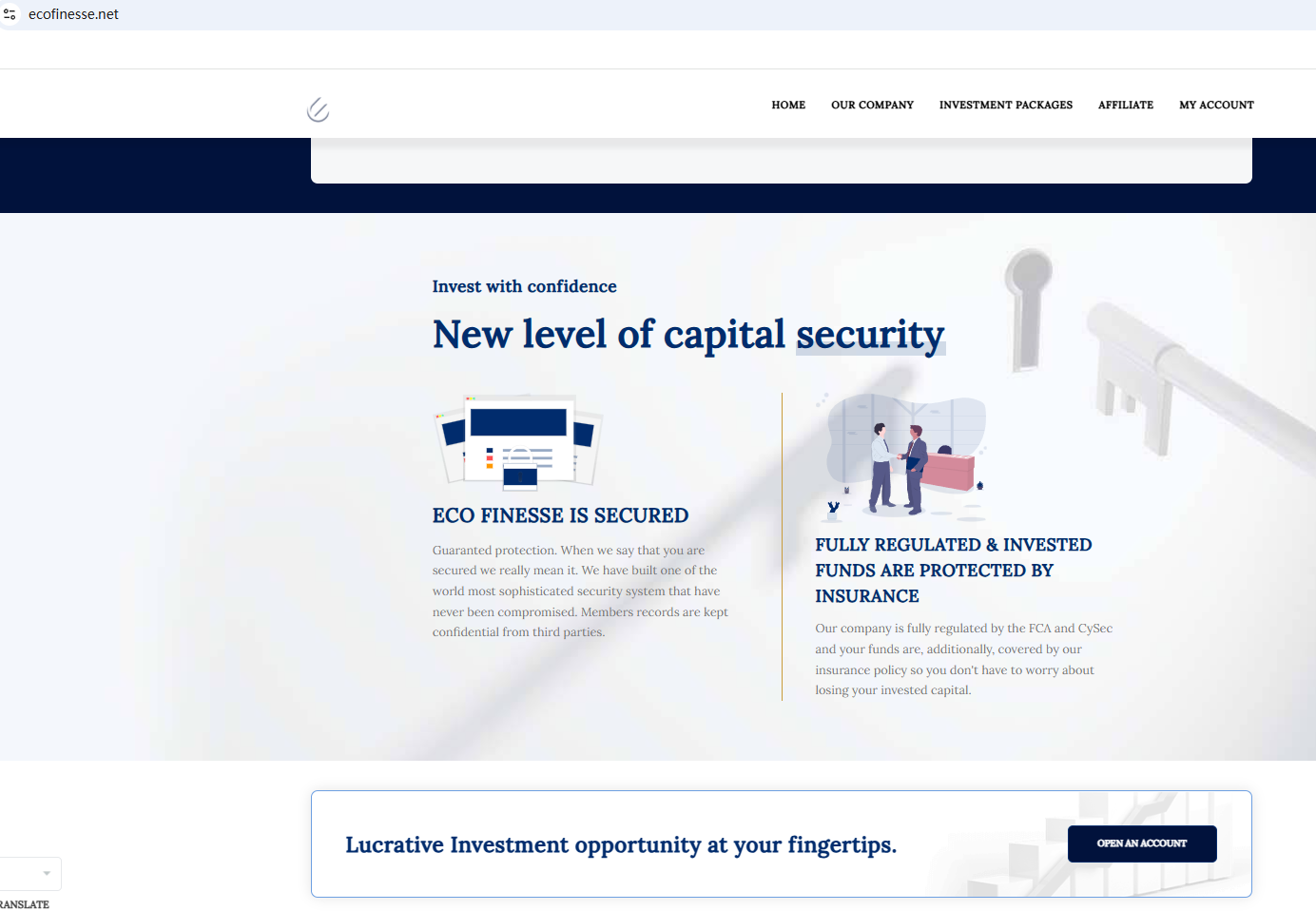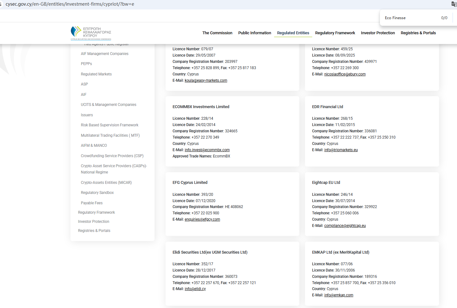 根据其网站信息,该公司受英国金融行为监管局 (FCA) 和塞浦路斯证券交易委员会 (CySEC) 的双重监管。然而,经查询,并未发现与 CySEC 信息相符的记录。此外,FCA 还就 Eco Finesse 发出警告,怀疑该公司可能在未获得必要授权的情况下提供金融服务或产品。