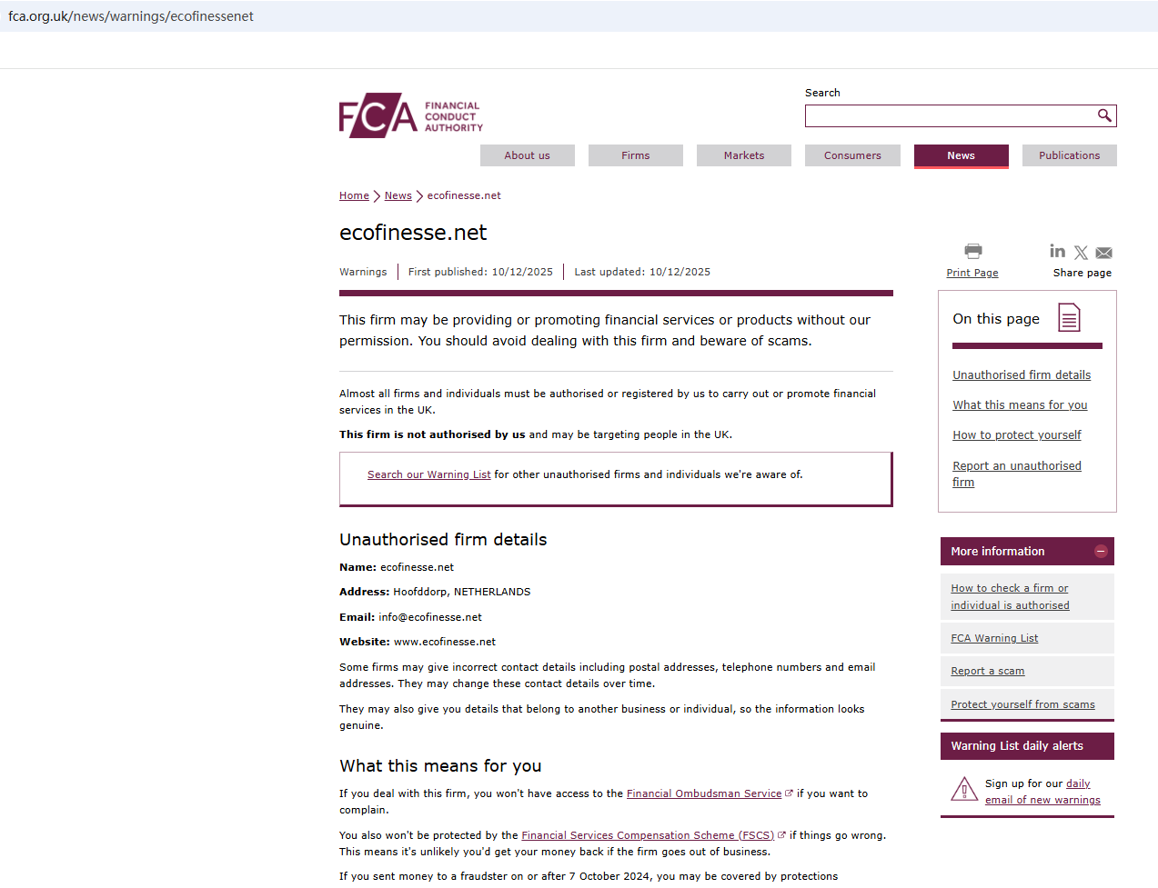 2025年12月10日,英国金融行为监管局(FCA)发布警告,怀疑Eco Finesse公司可能在未获得必要授权的情况下提供金融服务或产品。https ://www.fca.org.uk/news/warnings/ecofinessenet