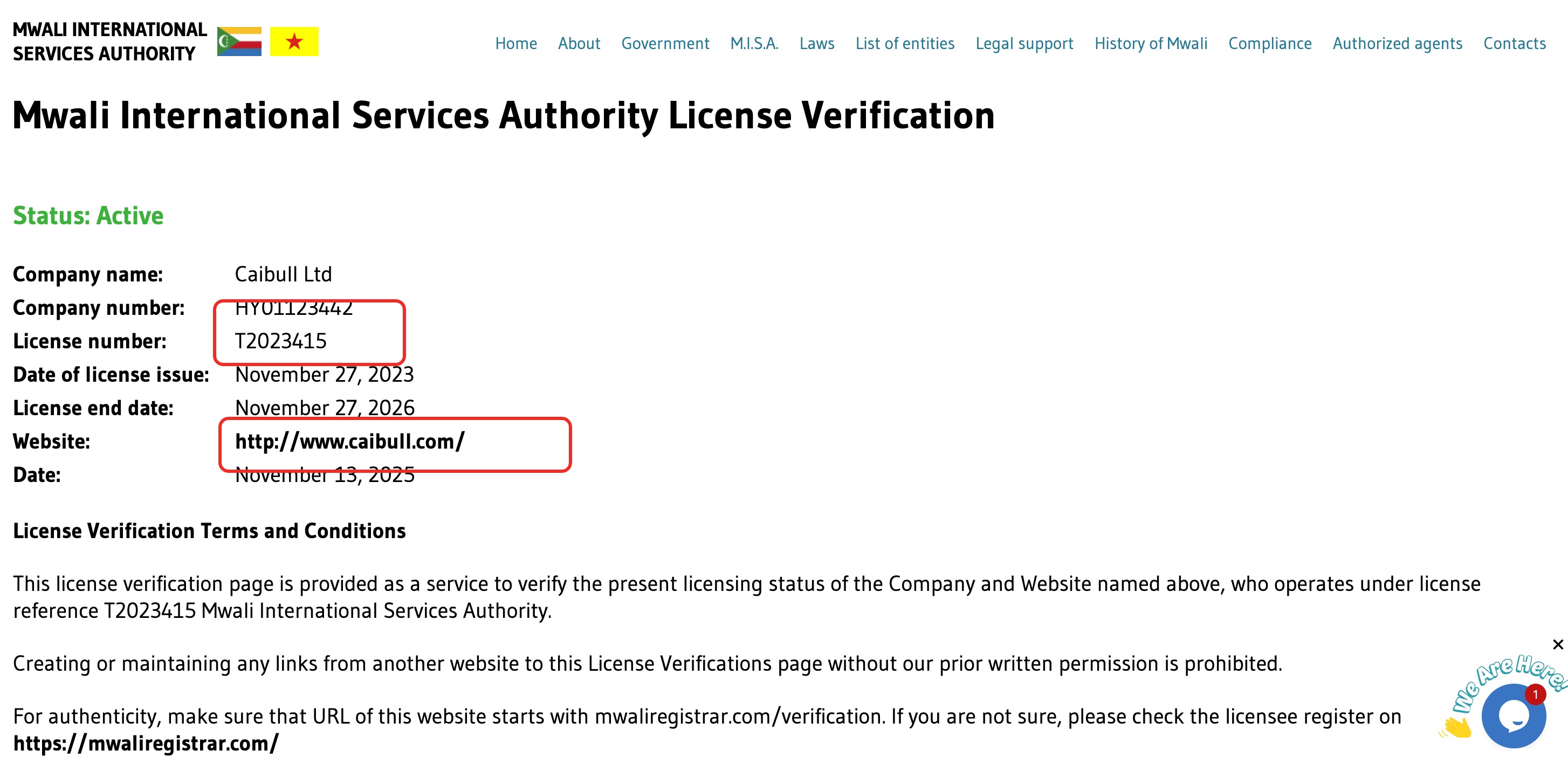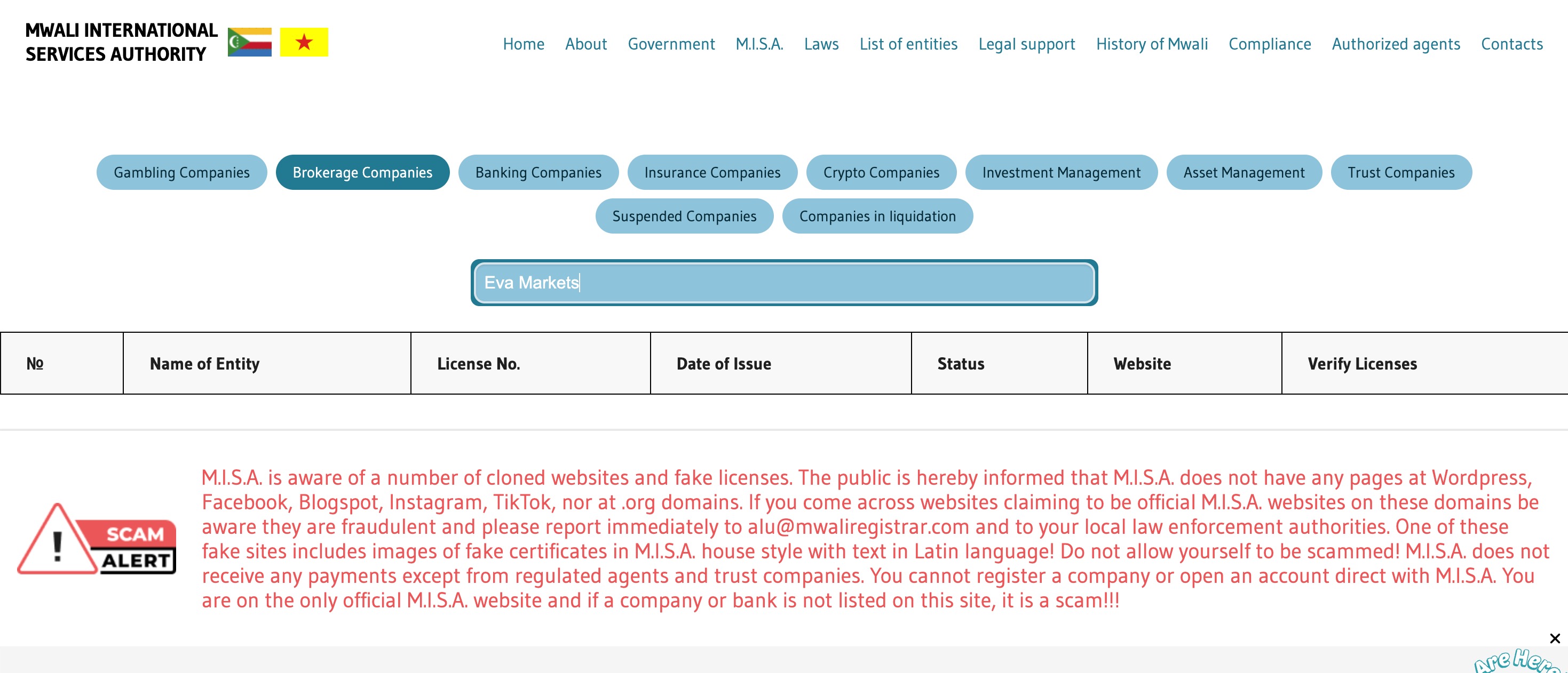 It had previously claimed to be regulated by the Mwali International Services Authority (MISA) under license number T2023415. However, recent checks reveal that this license is now associated with a different entity named Caibull, and no official records linking Eva Markets to MISA can be found on the regulator’s public database.