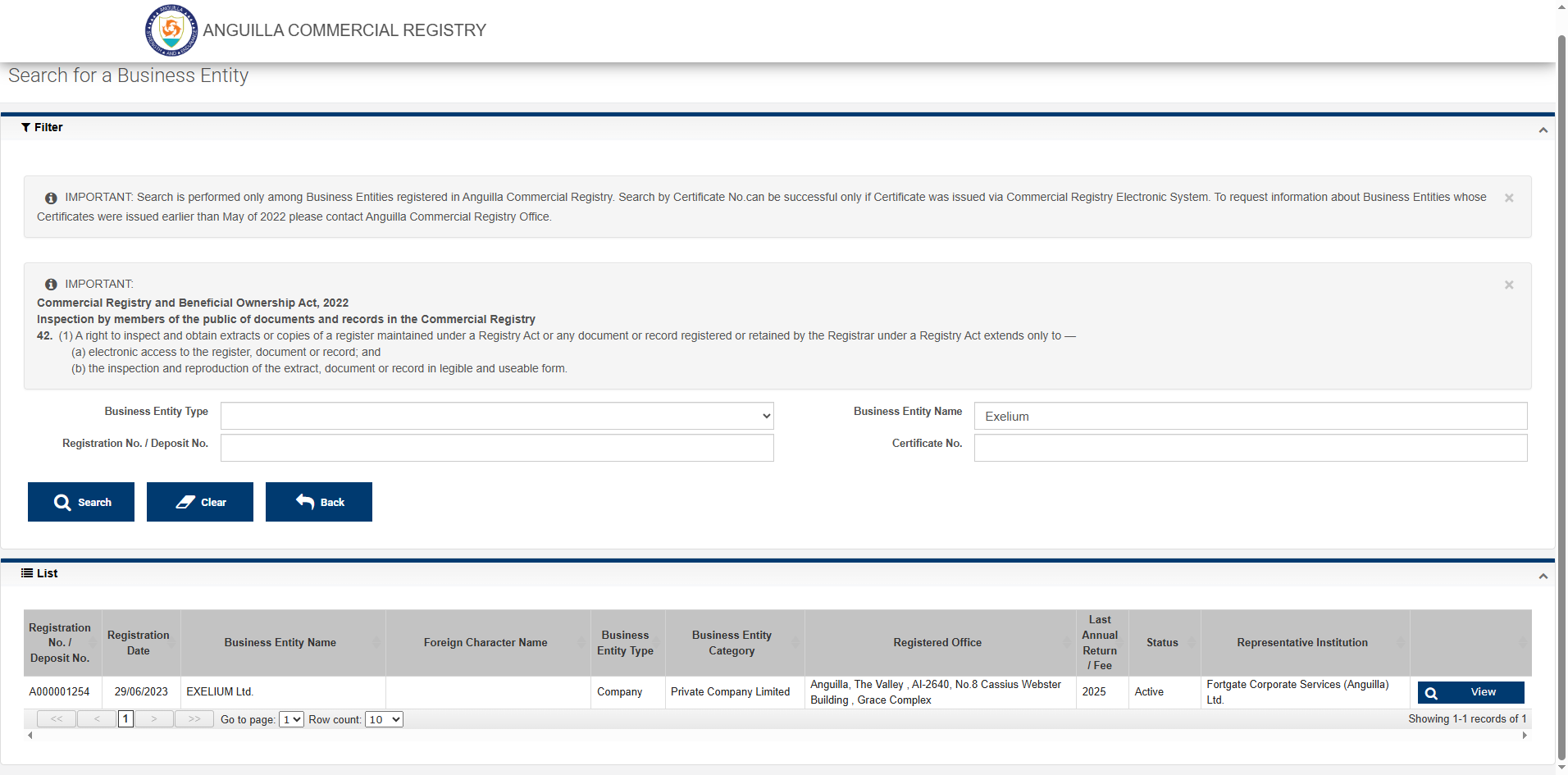 Exelium 声称是 Exelium Ltd 的交易名称,该公司在安圭拉注册。安圭拉商业注册处 (ACORN) 的检索结果显示,Exelium Ltd 的确存在注册信息。然而,需要注意的是,ACORN 仅是一个公司注册系统,它并不监管金融服务,也不颁发外汇或投资活动的许可证。该注册信息仅确认该公司作为一家法人实体存在,并不表明其获得任何形式的监管授权。