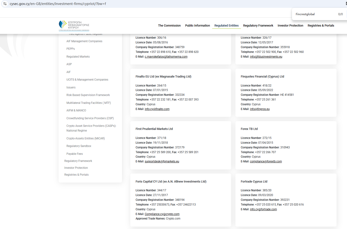 根据其网站信息,该公司受英国金融行为监管局 (FCA) 和塞浦路斯证券交易委员会 (CySEC) 的双重监管。然而,经查询,并未发现与 CySEC 信息相符的记录。此外,FCA 还发布了针对 Fincrestglobal 的警告,怀疑该公司可能在未获得必要授权的情况下提供金融服务或产品。