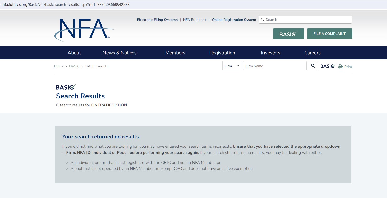 经调查,我们发现 FinTradeOption 不受美国国家期货协会 (NFA) 的监管。