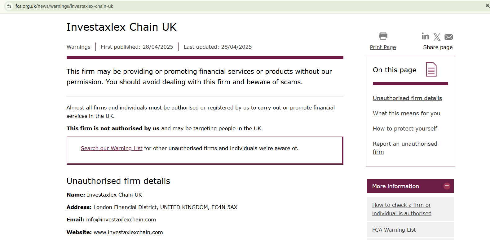 第三,Investaxlex Chain UK 谎称已获得金融行为监管局 (FCA) 的授权。作为回应,FCA 发出警告,明确表示 Investaxlex Chain UK 不受其授权,并建议投资者远离。