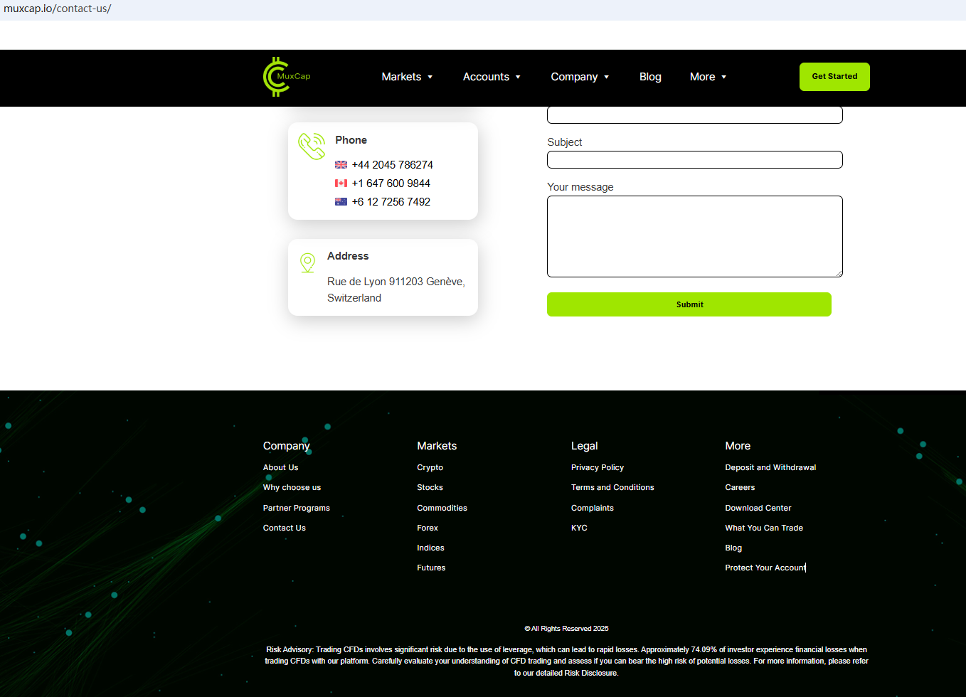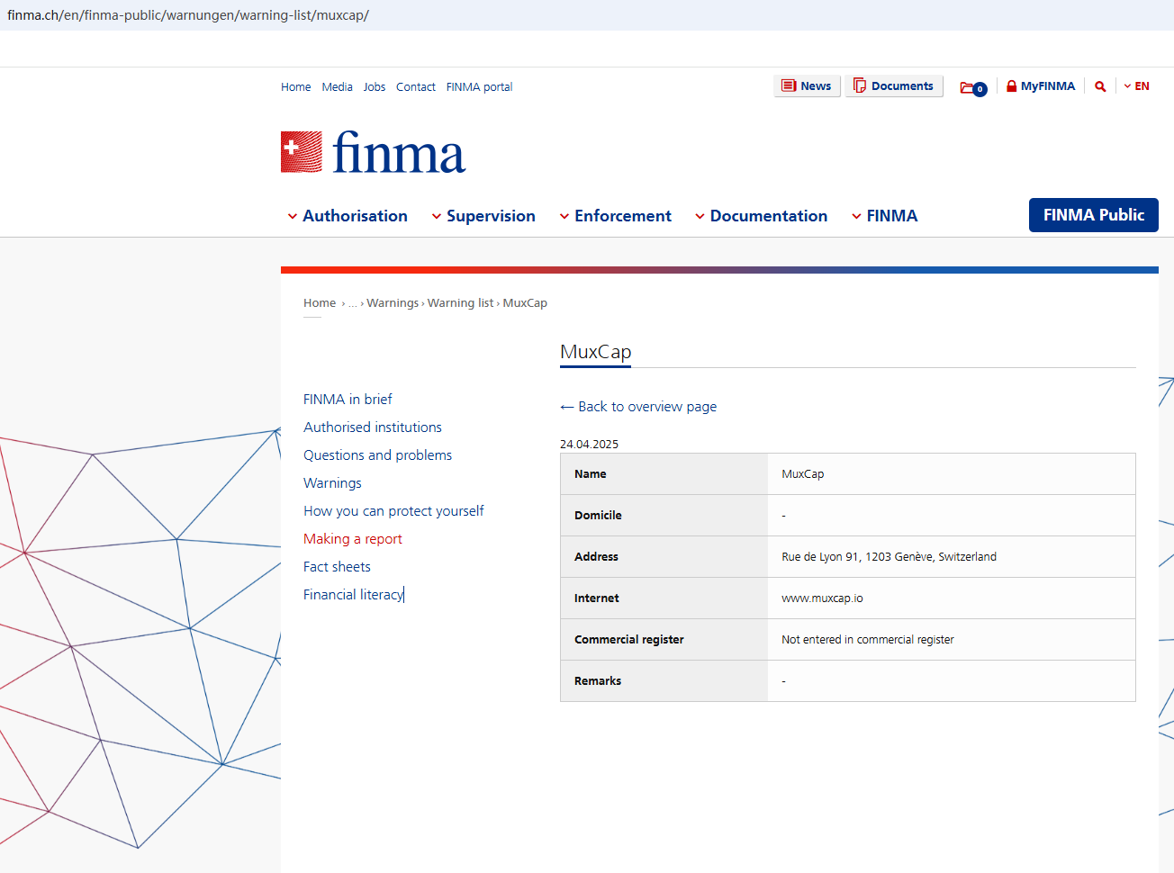 Moreover, the Swiss Financial Market Supervisory Authority (FINMA) has added MuxCap to its warning list, noting that this allegedly Switzerland-based firm is absent from the commercial register. This strongly indicates that MuxCap is neither properly registered nor supervised by regulatory authorities.
