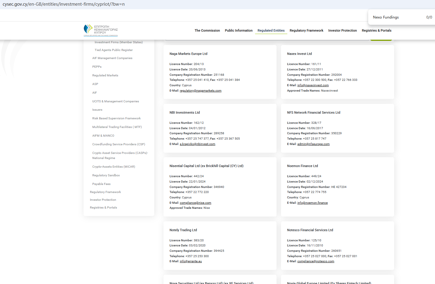 根据其网站信息,该公司受英国金融行为监管局 (FCA) 和塞浦路斯证券交易委员会 (CySEC) 的双重监管。然而,经查询,并未发现与 CySEC 记录相符的信息。此外,FCA 还就 Nexo Fundings 发出警告,怀疑该公司可能在未获得必要授权的情况下提供金融服务或产品。