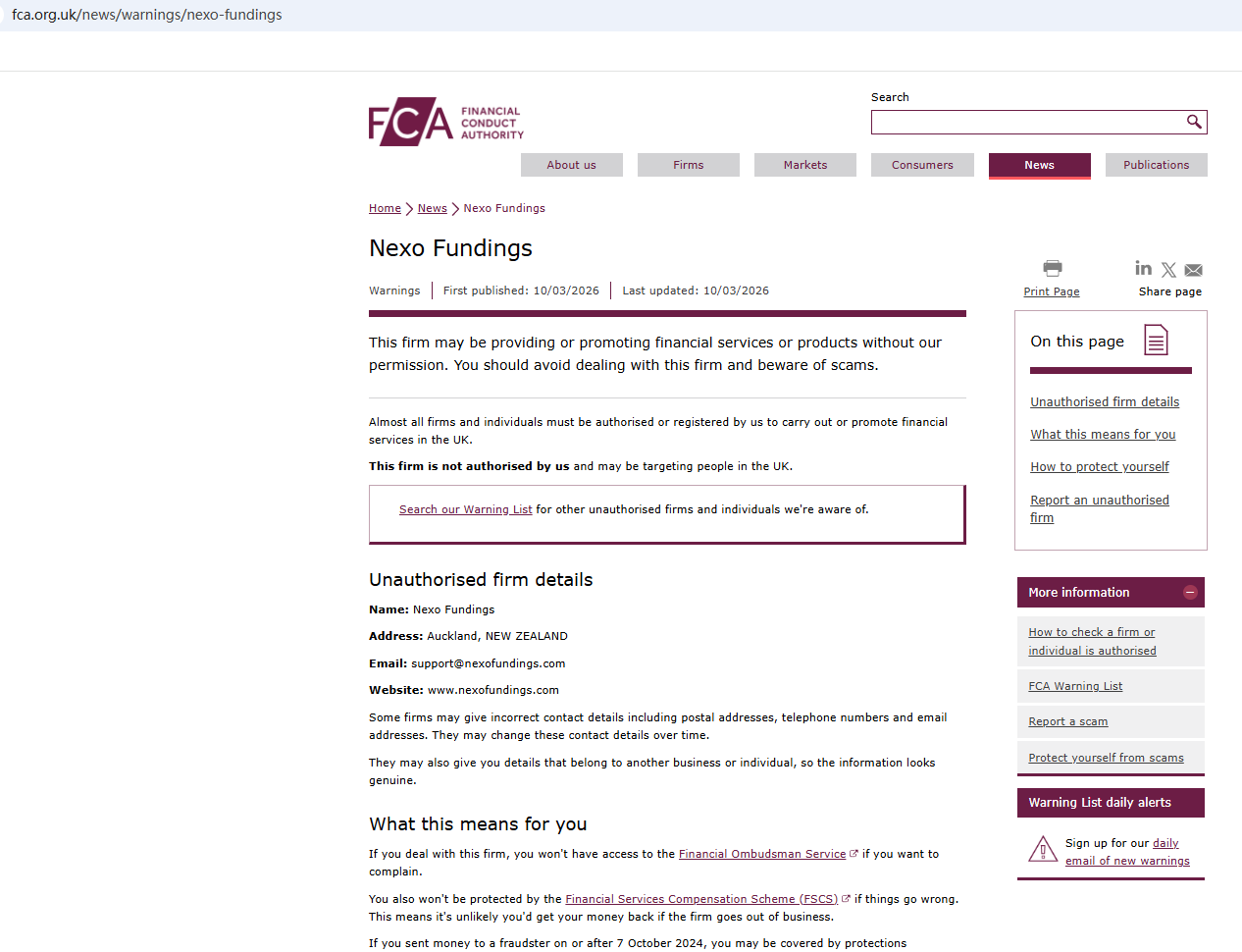 2026年3月10日,英国金融行为监管局(FCA)发布警告,怀疑Nexo Fundings公司可能在未获得必要授权的情况下提供金融服务或产品。https ://www.fca.org.uk/news/warnings/nexo-fundings