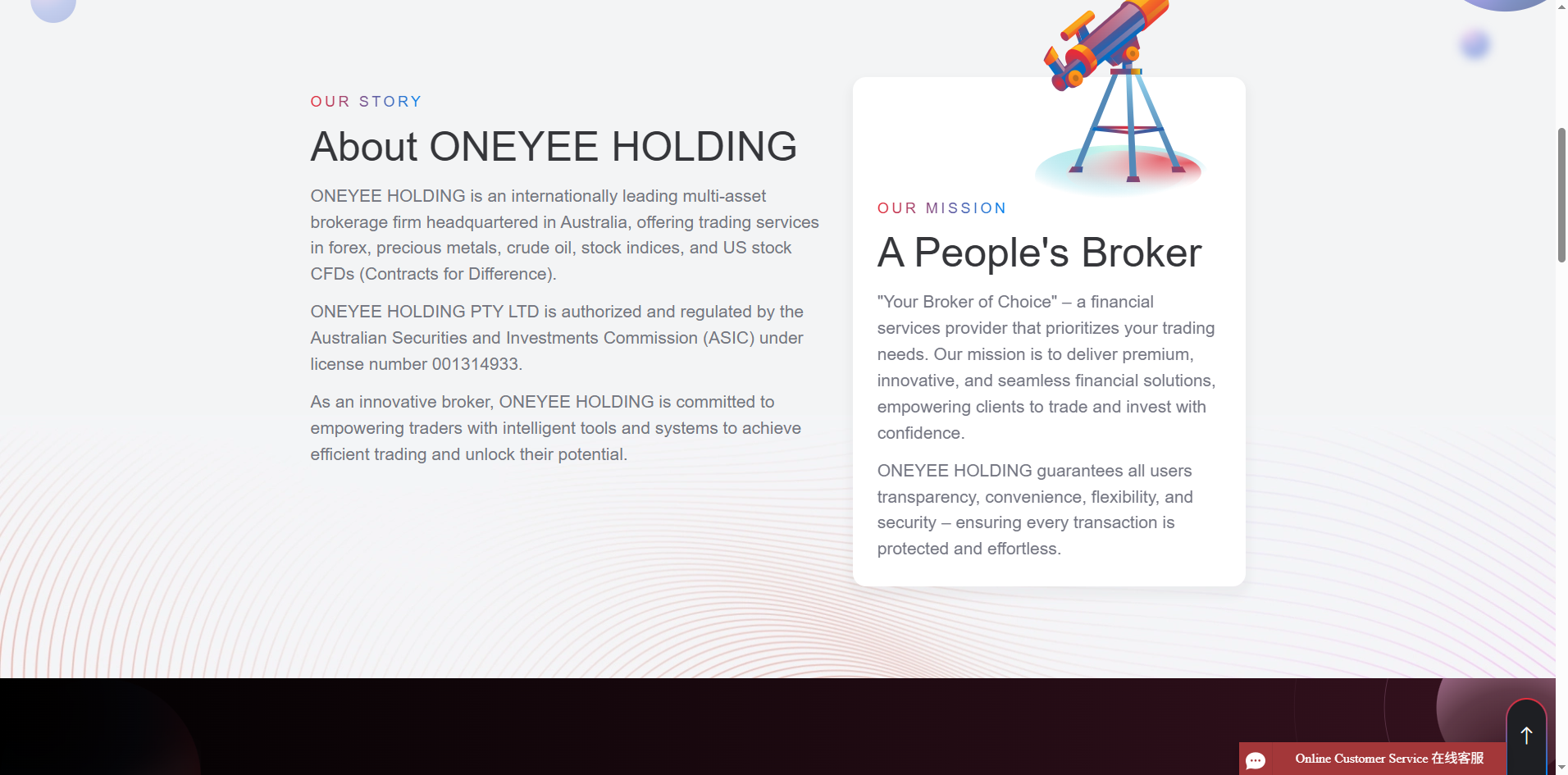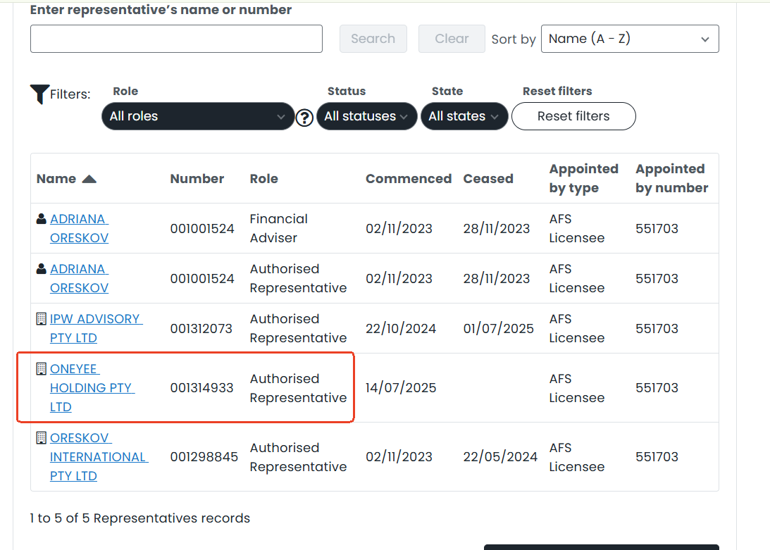 ONEYEE HOLDING声称由ONYEE HOLDING PTY LTD运营,并由澳大利亚证券和投资委员会(ASIC)作为授权代表(AR)监管。 虽然AR实体确实在ASIC的登记册上列出,但它所代表的主要被许可人不持有零售外汇交易或投资执行的授权。