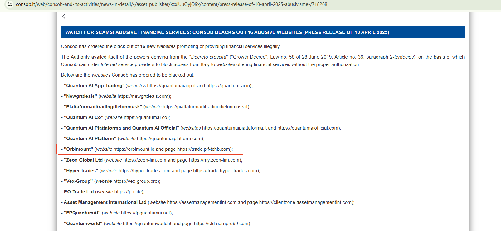 • 2025-04-09 CONSOB将Orbimount列入其警示名单