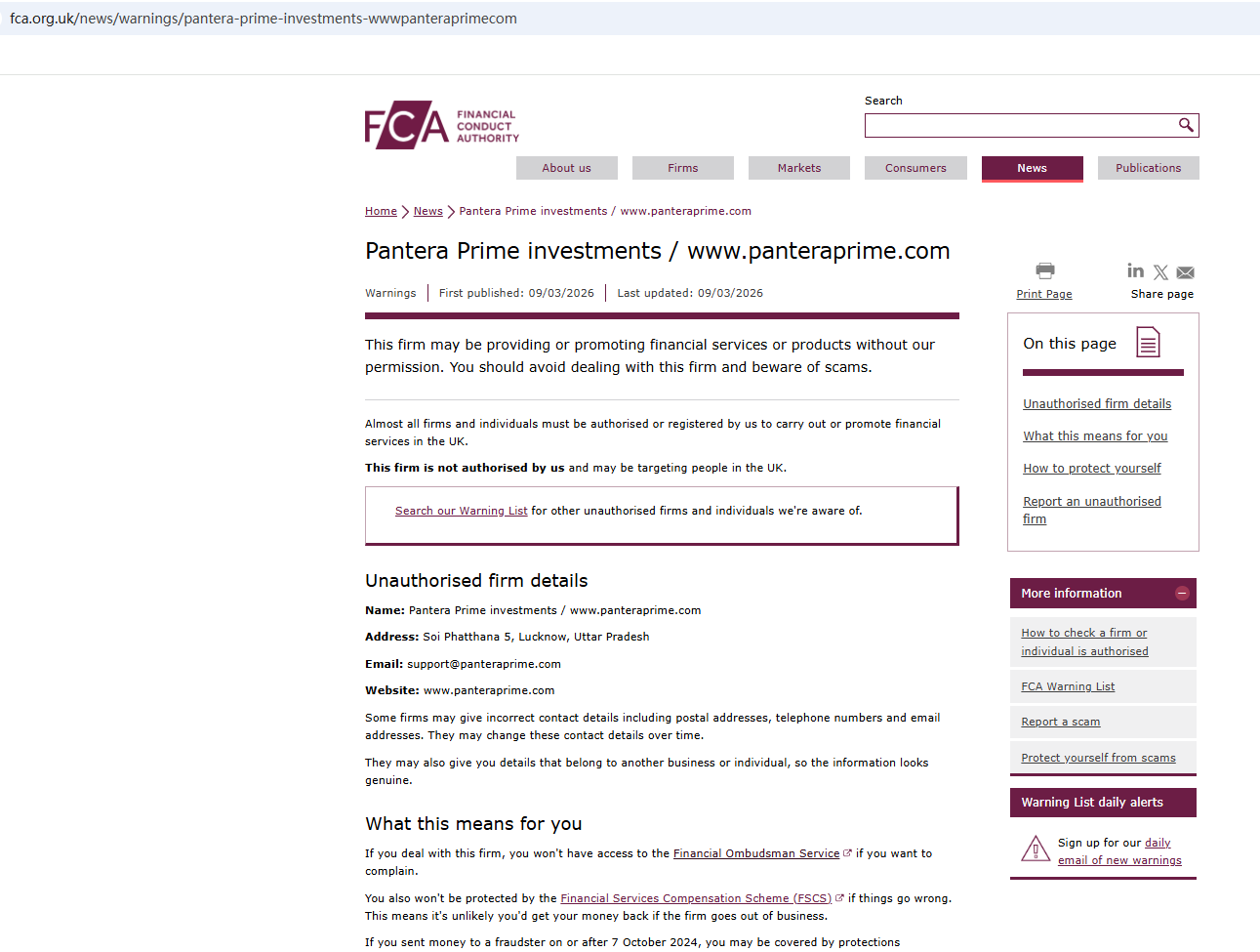 2026年3月9日,英国金融行为监管局(FCA)发布警告,怀疑Pantera Prime投资公司可能在未获得必要授权的情况下提供金融服务或产品。https ://www.fca.org.uk/news/warnings/pantera-prime-investments-wwwpanteraprimecom