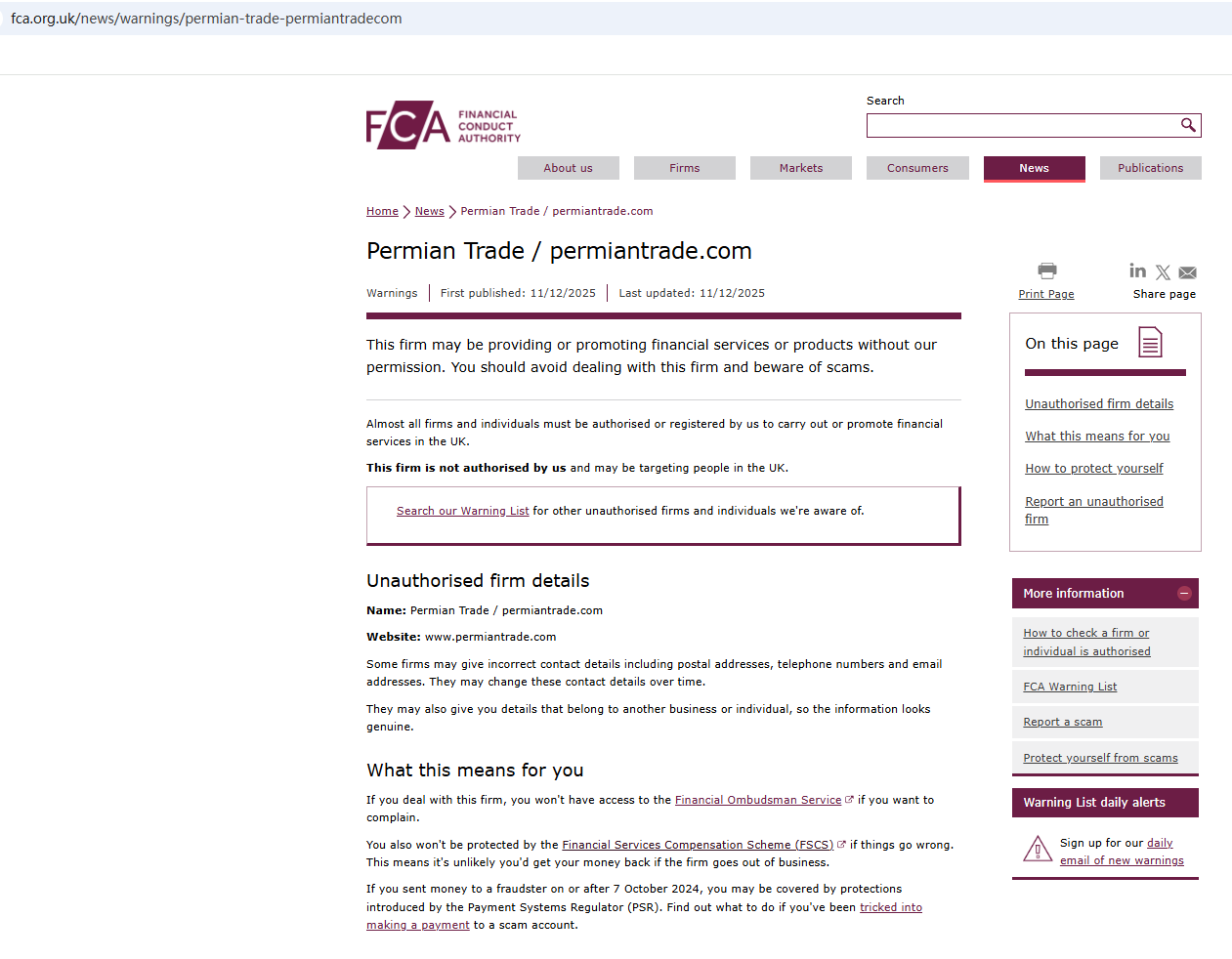 2025年12月11日,英国金融行为监管局(FCA)发布警告,怀疑Permian Trade公司可能在未获得必要授权的情况下提供金融服务或产品。https ://www.fca.org.uk/news/warnings/permian-trade-permiantradecom