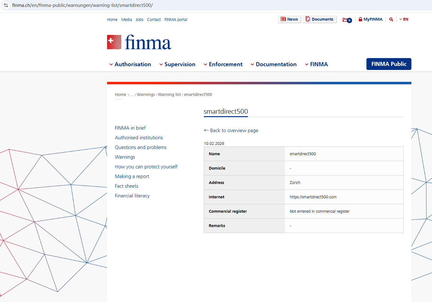 2026年2月10日,瑞士金融市场监管局(FINMA)发布警告,指出SmartDirect500未在其商业登记册中注册。https ://www.finma.ch/en/finma-public/warnungen/warning-list/smartdirect500/