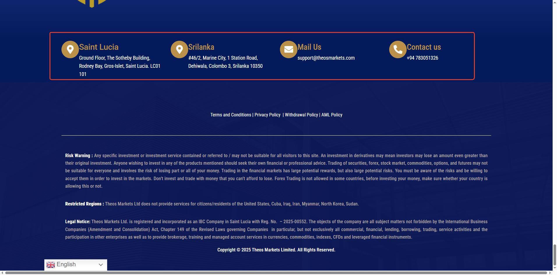 Theos Markets并未声称获得任何监管机构的许可;它仅声称在圣卢西亚注册。虽然我们可以确认圣卢西亚国际金融中心(IFC)注册处存在一家同名公司,但该注册仅授予其国际商业公司(IBC)地位。这并不构成有效的金融牌照。IFC既不监管也不颁发外汇交易许可证。