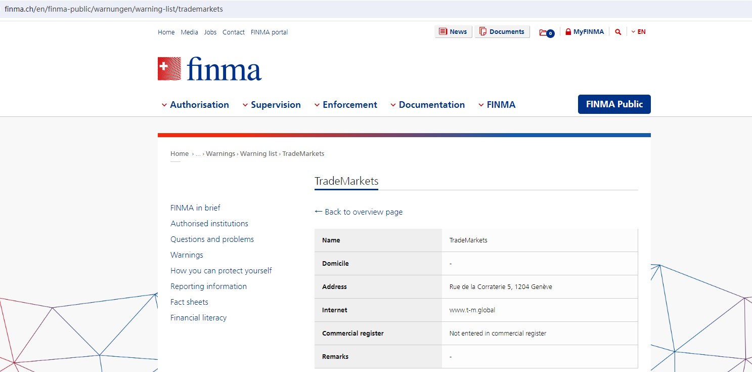 The Swiss Financial Market Supervisory Authority (FINMA) has issued a warning against TradeMarkets, explicitly stating that the broker is not under its supervision.