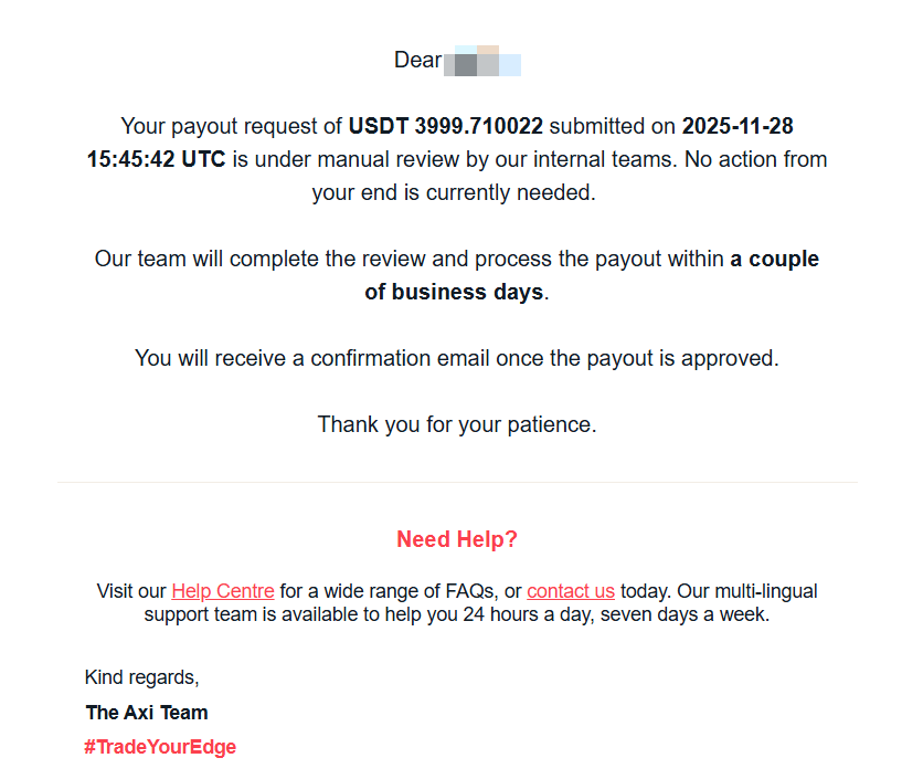 On November 28, 2025, I submitted a withdrawal request of $4,000 to Axi. My account balance was $5,251, for a total of $9,251. Axi is still deliberately delaying the withdrawal. I contacted customer service, but they requested various personal information, which I provided. They told me it would be processed within three days, but a month has passed and the withdrawal has still not arrived.