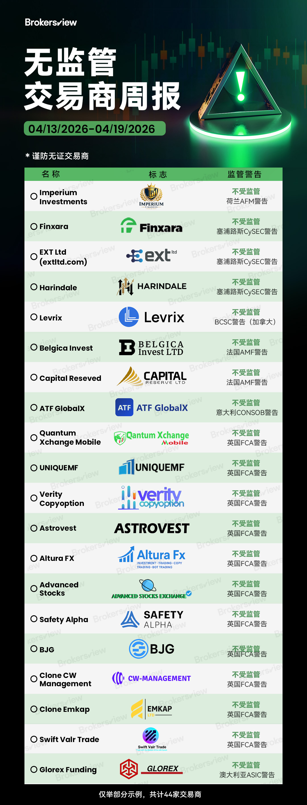 在 4 月 13 日至 19 日这一周,Brokersview 共发现了 44 家不受监管或受到监管机构警告的交易商。