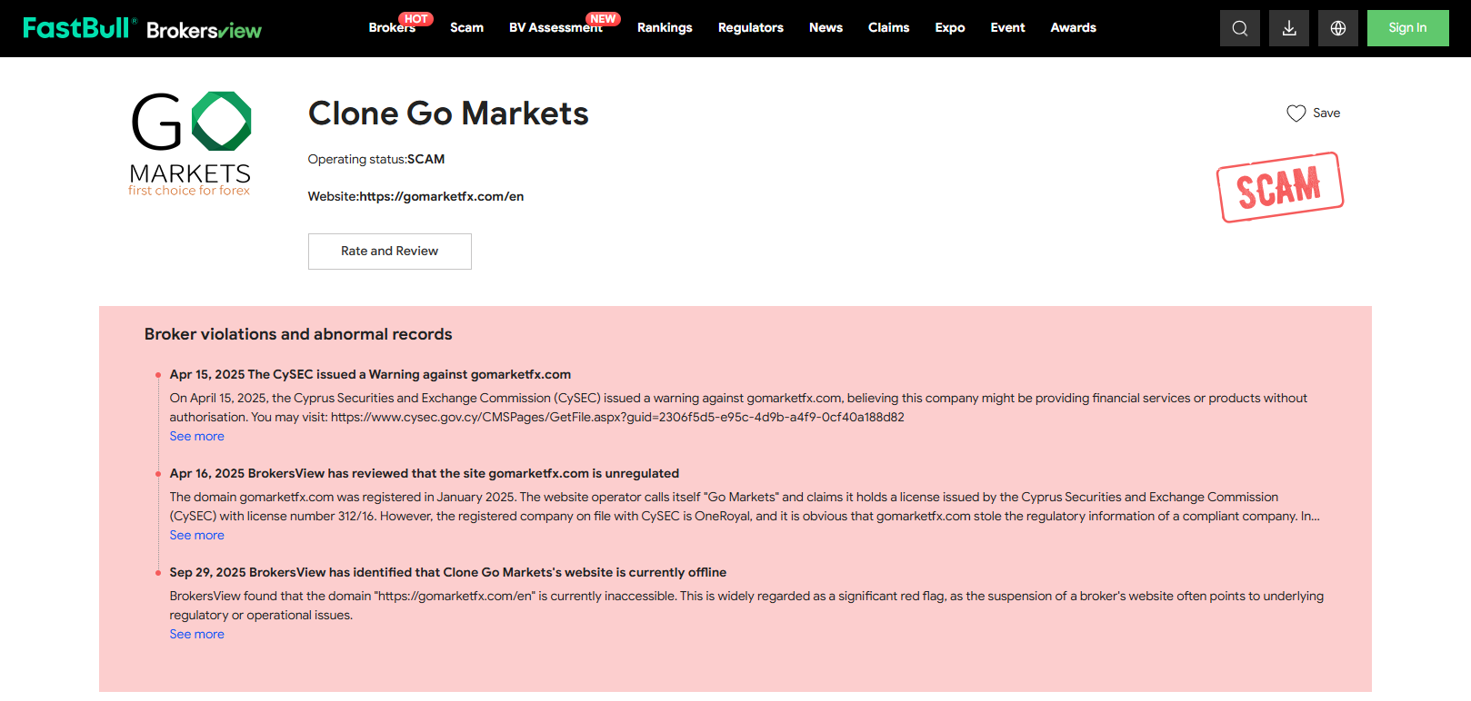 截至2025年9月29日,克隆网站gomarketfx.com已停止运营。此类突然关闭通常被认为是高风险的预警信号,往往表明: