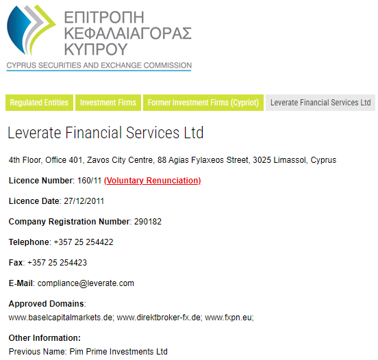 Leverate Financial Services投资者赔偿基金成员资格的撤销是在CySEC决定撤销其塞浦路斯投资公司 (CIF) 授权后进行的。CySEC于2月8日宣布撤销 Leverate Financial Services Ltd的CIF授权(编号为160/11),原因是该公司决定明确放弃该授权。Leverate Financial Services Ltd通过域名www.direktbroker-fx.de和www.fxpn.eu提供差价合约和外汇服务。