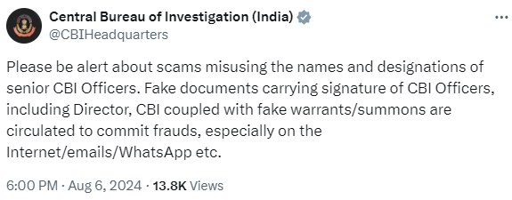 印度中央调查局(CBI)在 X(前Twitter)上发布了一则警告,提醒人们警惕滥用该局高级官员姓名和头衔的诈骗。