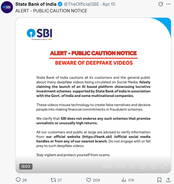 该银行敦促客户通过官方渠道核实信息,以免上当受骗。此外,SBI还警告说,不要点击可疑链接或根据深度伪造视频分享个人和财务细节。