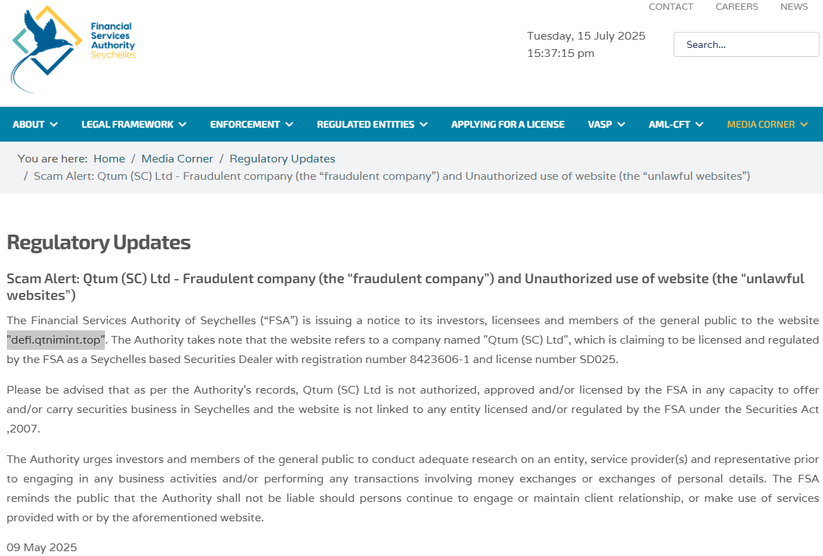 塞舌尔FSA警告:Defi.qtnimint.top的运营商Qtum (SC) Ltd谎称在塞舌尔获得了运营许可