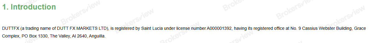 此外,DUTTFX声称在圣卢西亚注册,并列出了其位于安圭拉的注册办公地址。然而,这两个司法管辖区都不提供专门针对外汇经纪商的当地监管。