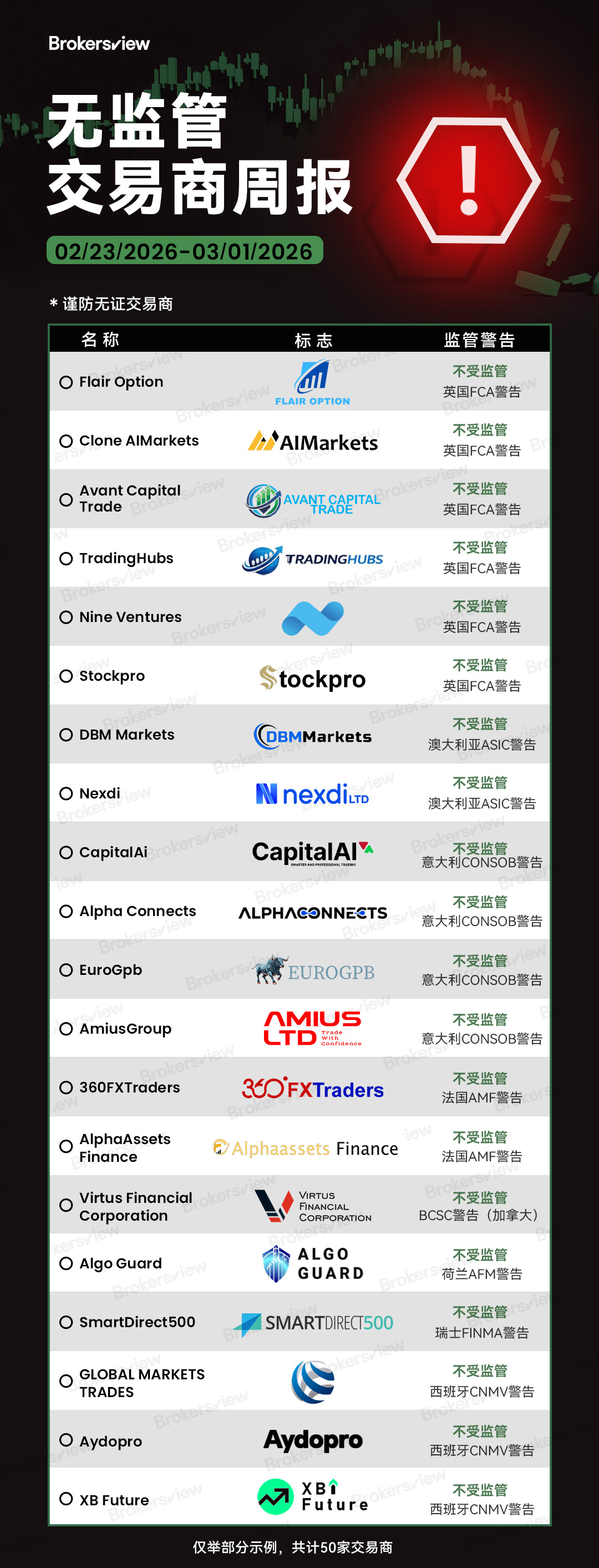 BrokersView 发布的一份新的调查报告显示,在 2026 年 2 月 23 日至 3 月 1 日这一周内,有 50 家无牌经纪商开展了误导性的在线交易计划。