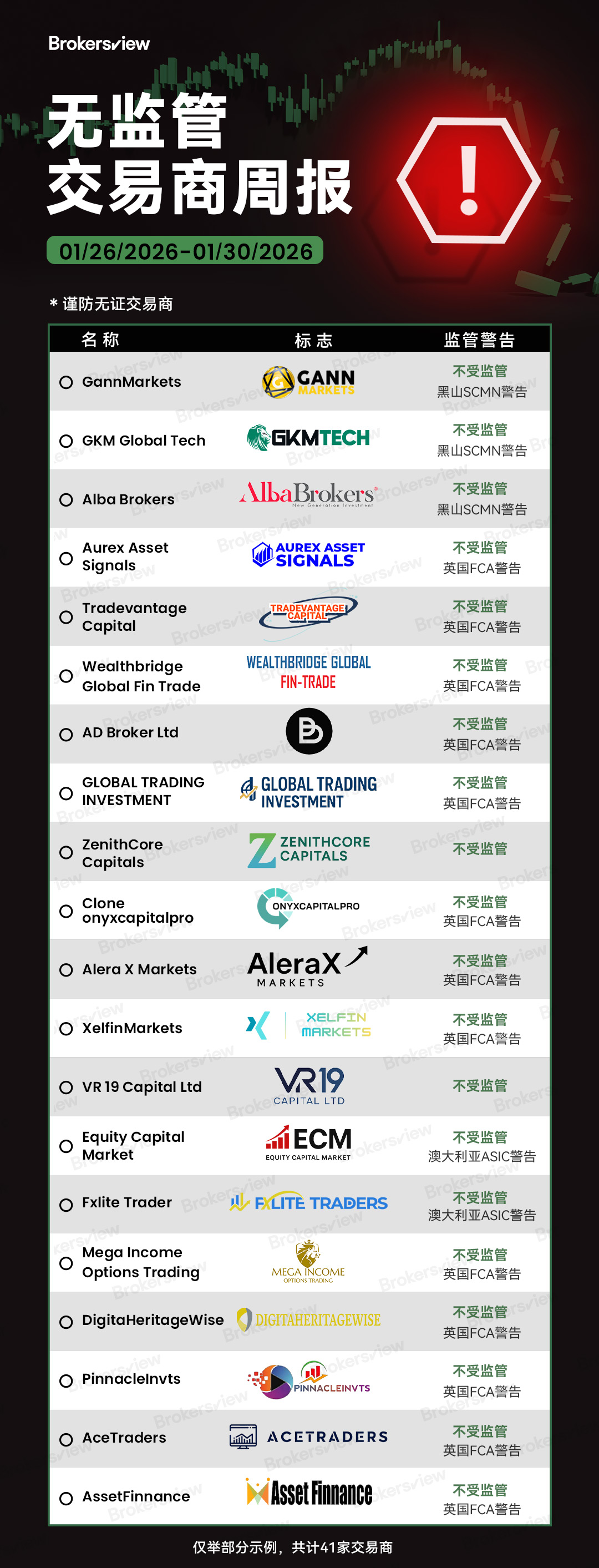 BrokersView于2026年1月26日至2026年1月30日曝光的诈骗交易商: