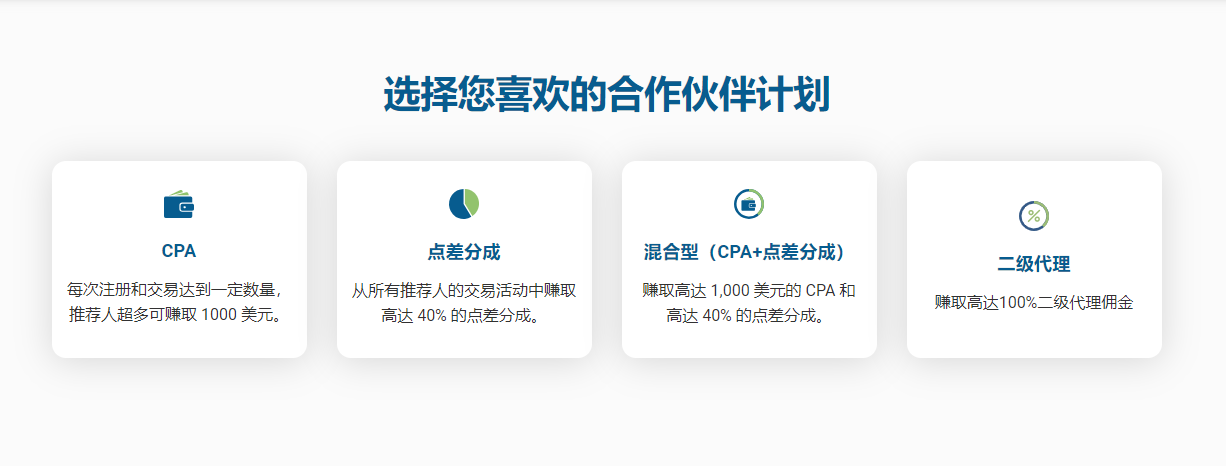 混合模式(CPA+点差分成):结合CPA和点差分成,最高可获 1,000美元+40%点差分成!既享受一次性高额奖励,又能获得持续的交易佣金。
