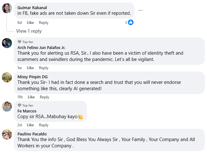 一些用户回复了Ang的帖子,感谢他提高人们的防范意识,以及建议大家提高警惕,防止成为这些骗局的受害者。Ramon S. Ang在警告的最后建议,不要参与或投资任何声称获得他背书的虚假计划。
