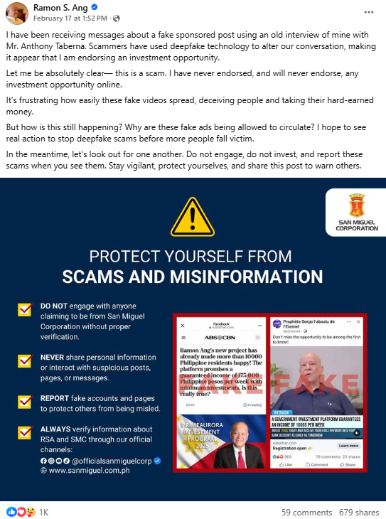 生力集团(San Miguel Corporation)董事长Ramon S. Ang在Facebook上发布了一则公众警告,内容涉及使用他的照片为“投资机会”背书的网络帖子。Ramon Ang透露,他收到了一些关于该虚假赞助帖子的信息,该帖子使用了深度伪造技术来更改一个旧采访中的对话,使人以为他在为投资机会代言。