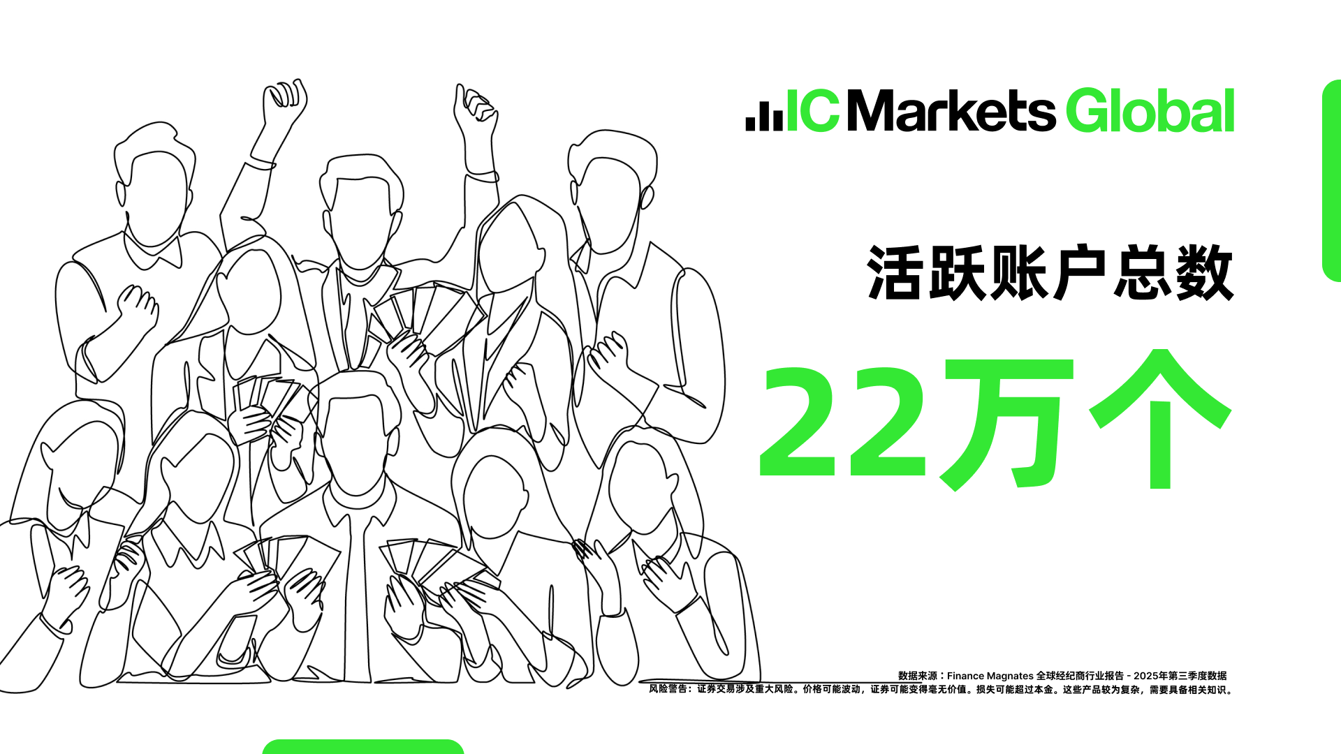 截至 2025 年第三季度,IC Markets 的 活跃交易账户总数已达 22 万,体现了全球交易者对平台稳定性和专业服务的高度认可。客户的信赖是 IC Markets 持续优化服务、拓展产品线和提升用户体验的最大动力。