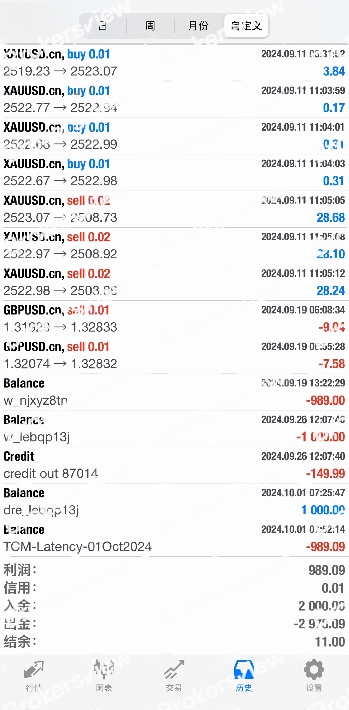 从9月2日开始,投资者主要交易黄金,持仓大小不一,从0.01手到0.2手不等。经过多次交易,到9月19日,账户已盈利989美元。他第一次申请提现,平台处理迅速,两天后钱就到账了。第一次提现的顺利让投资者对蓝莓市场的信誉产生了信任。不过,他并没有收到承诺的京东购物卡。